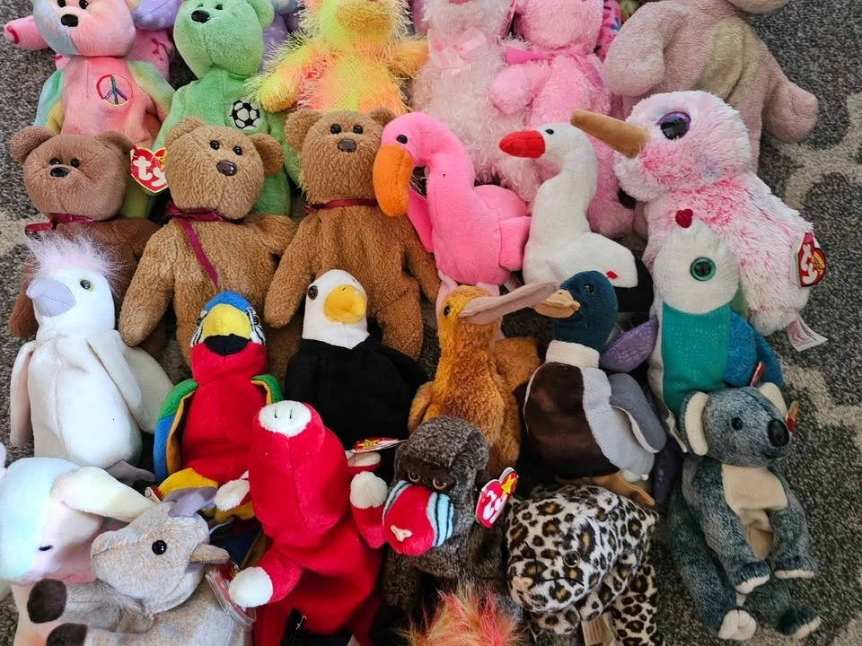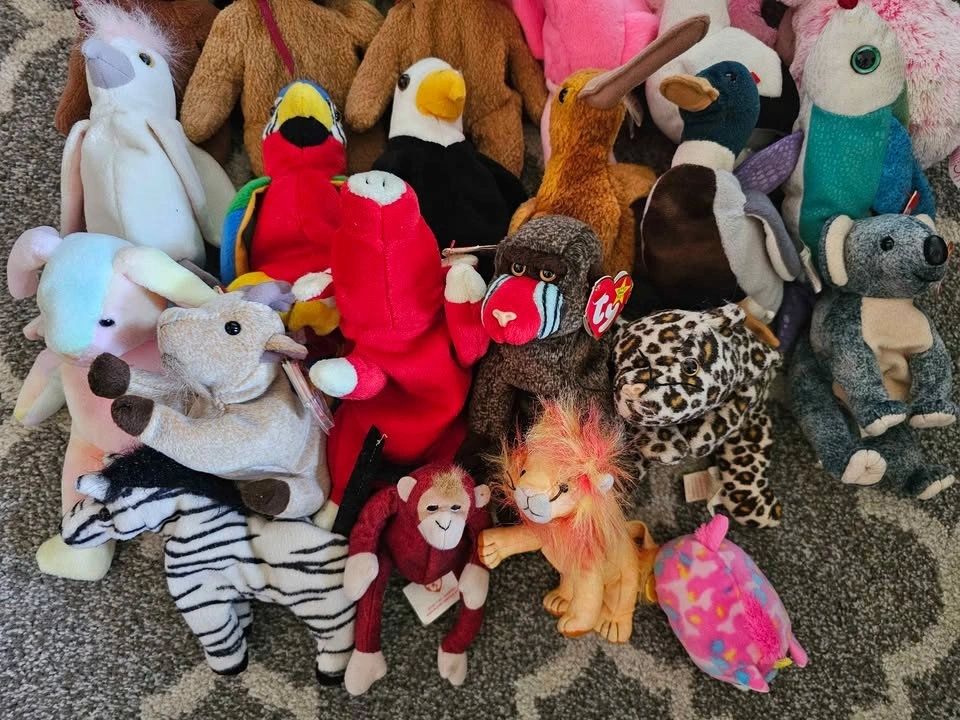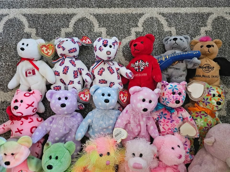 Selling a large collection of 40 plush collectibles. Perfect for a collector looking to fill gaps or for a reseller. Highlights include: Hard Rock Cafe Bears: Limited edition city bears from Vancouver, San Antonio, and Niagara Falls. International Ty Bears: Maple (Canada), 2x Britannia (UK), and the 10th Anniversary Decade bear. Classic Animals: Peace (Tie-dye), Kicks (Soccer), Pinky (Flamingo), Jabber (Parrot), Jake (Duck), and many more zoo/safari animals. Bonus: Includes one large Beanie Buddy (Pink Monkey). Most are in "like new" condition with tags attached. A few in the lot have minor staining/wear and are priced accordingly as part of the bundle. Kicks has a stain his ear, the Valentine's Day bear has a stain on the front, and the larger Beanie Buddy is well loved (see photos). Selling as a lot. Potentially open to selling individual items.