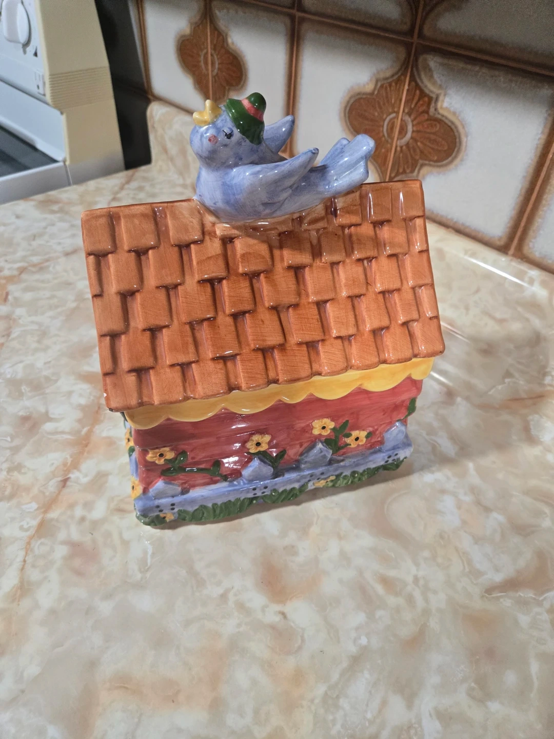 This charming ceramic cookie jar is shaped like a colourful little house, complete with a bird on the roof.