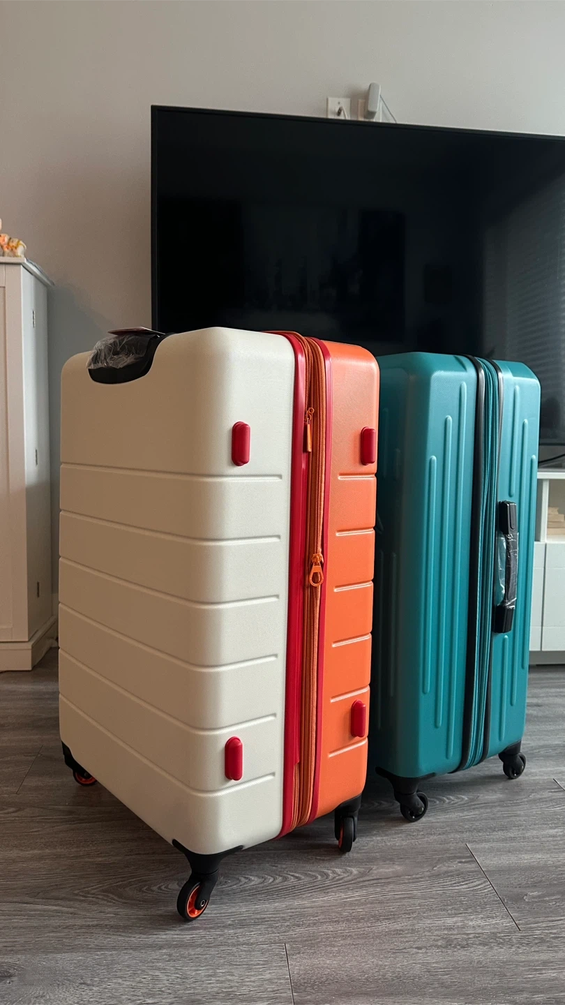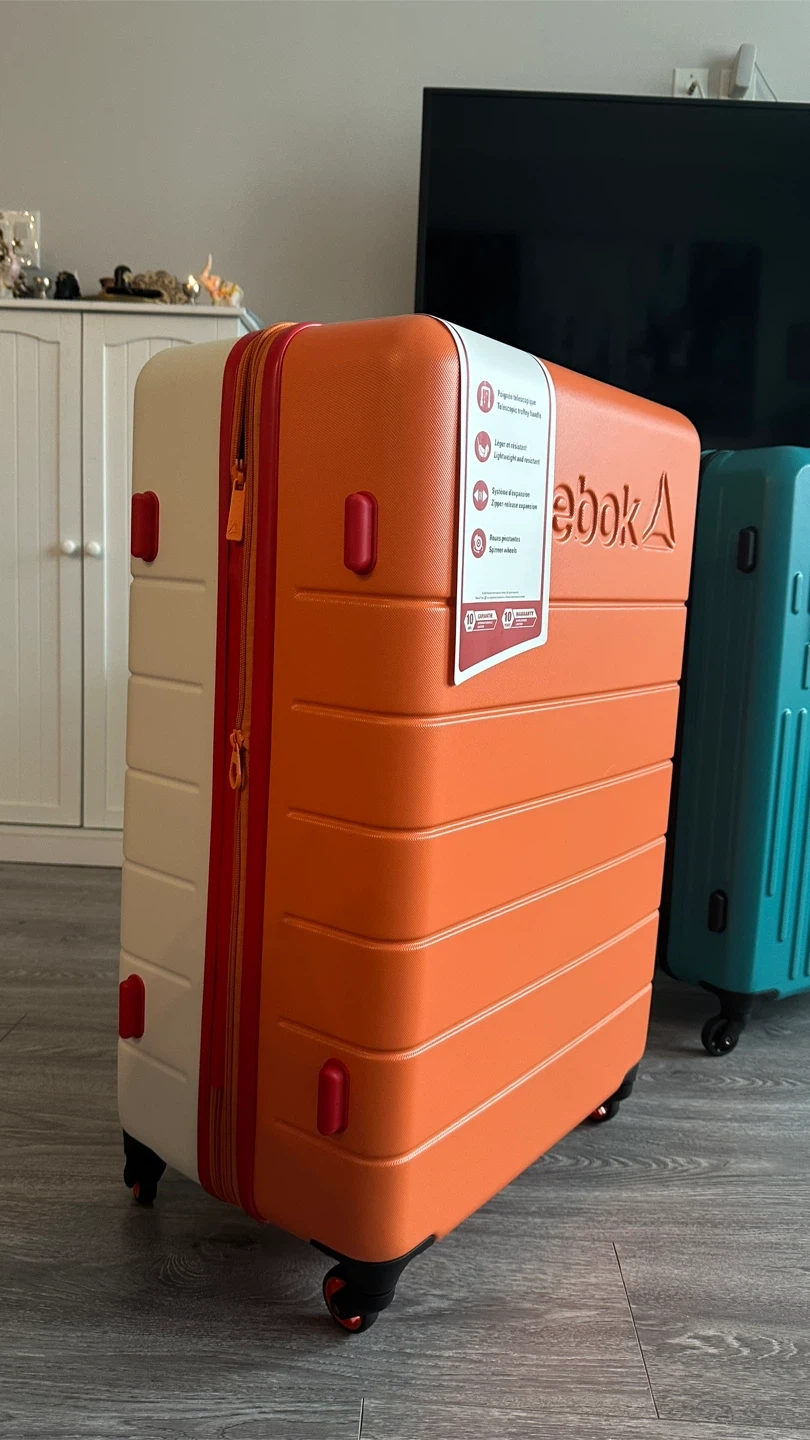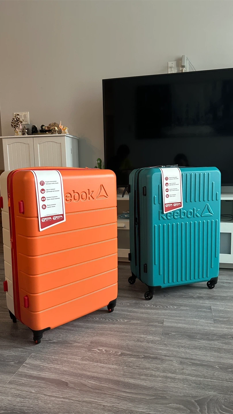 This set includes two Reebok suitcases, one orange and white, and one teal. They're designed to be lightweight and durable. Both feature smooth-rolling spinner wheels.