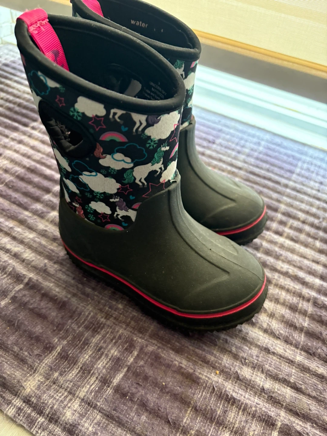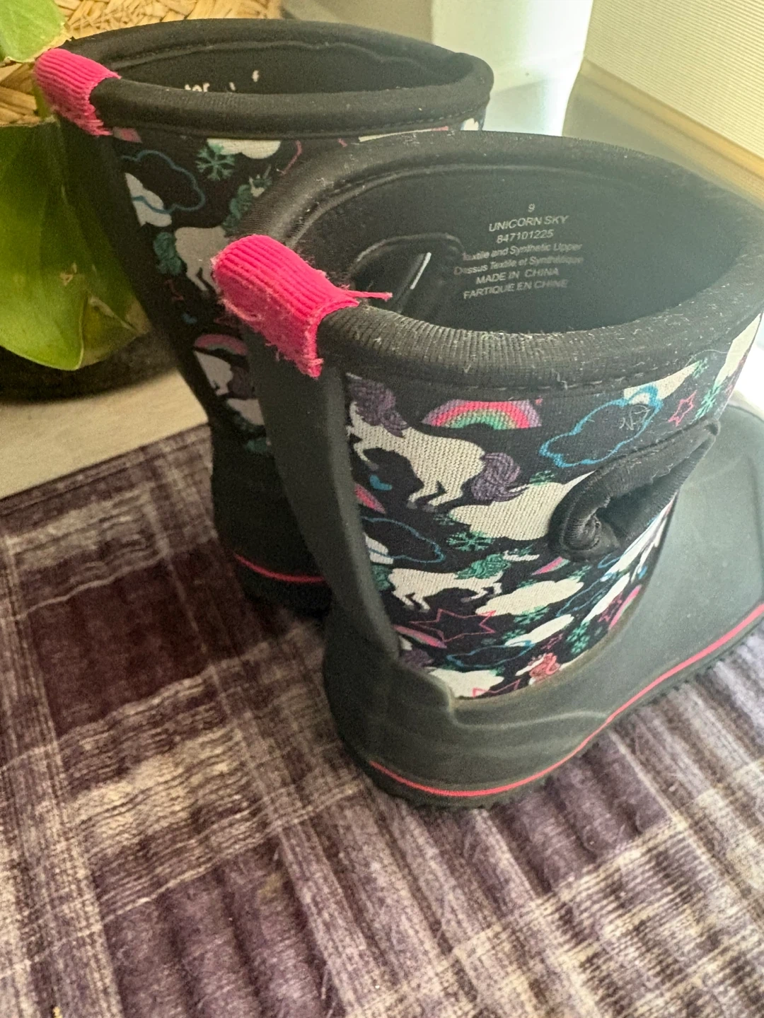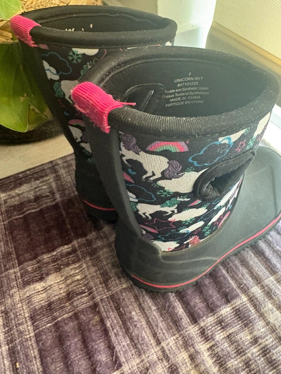 Kids' "Unicorn Sky" boots from Bogs in a size 9. These boots have a textile and synthetic upper with a fun unicorn and cloud pattern. Easy pull-on handles.