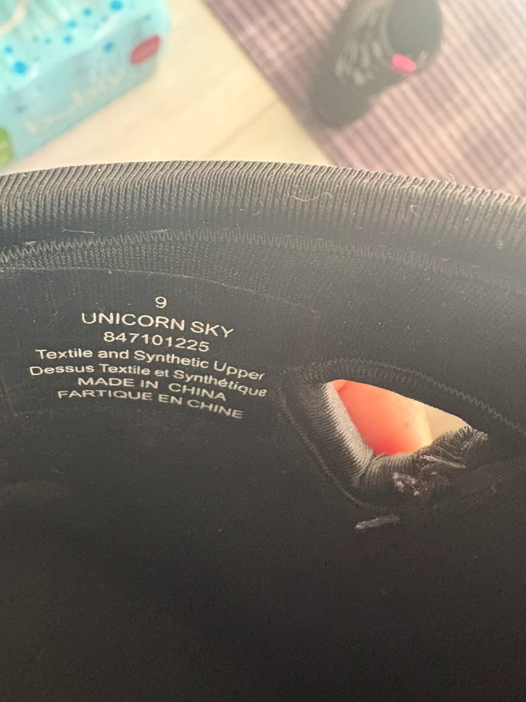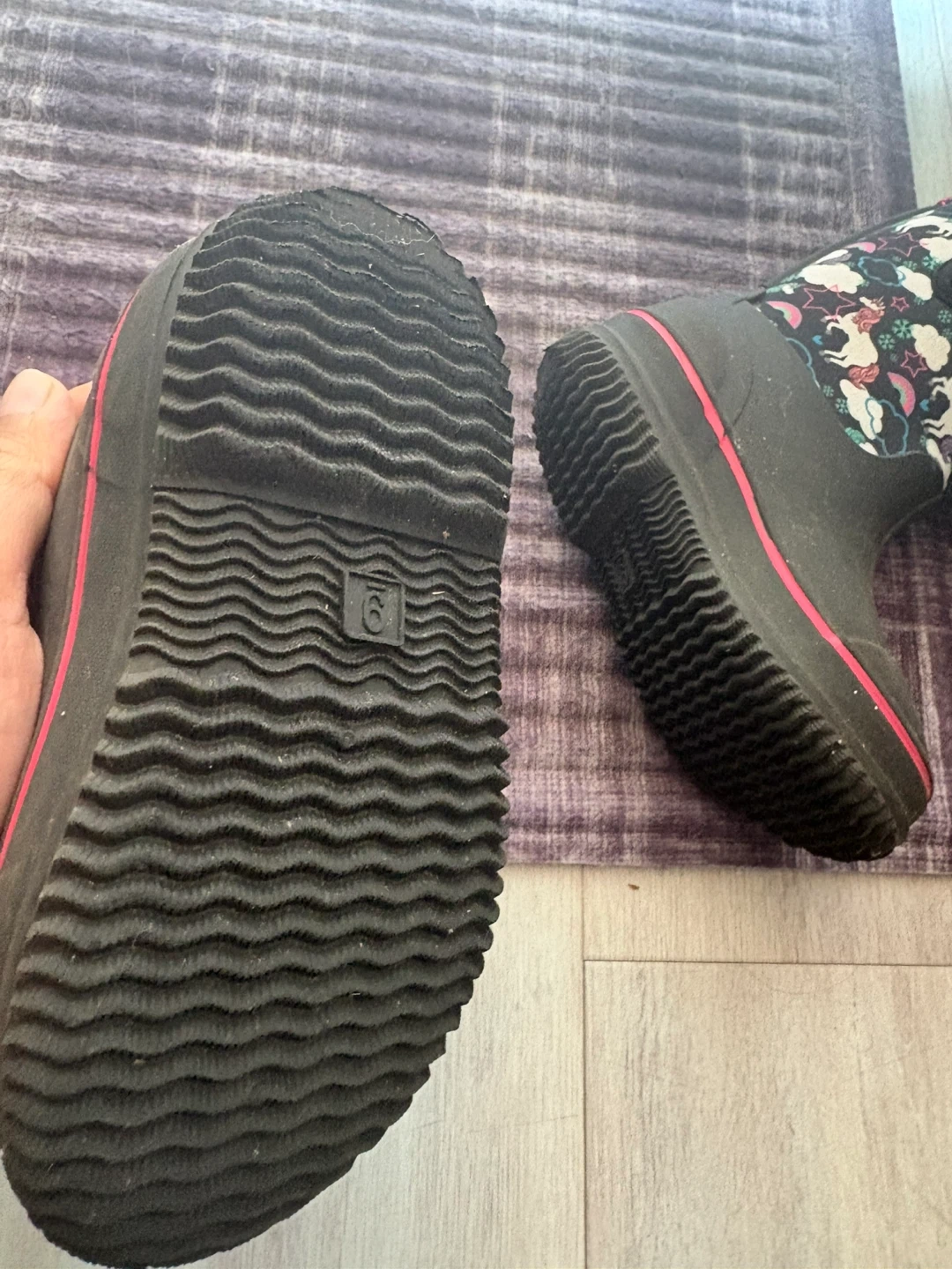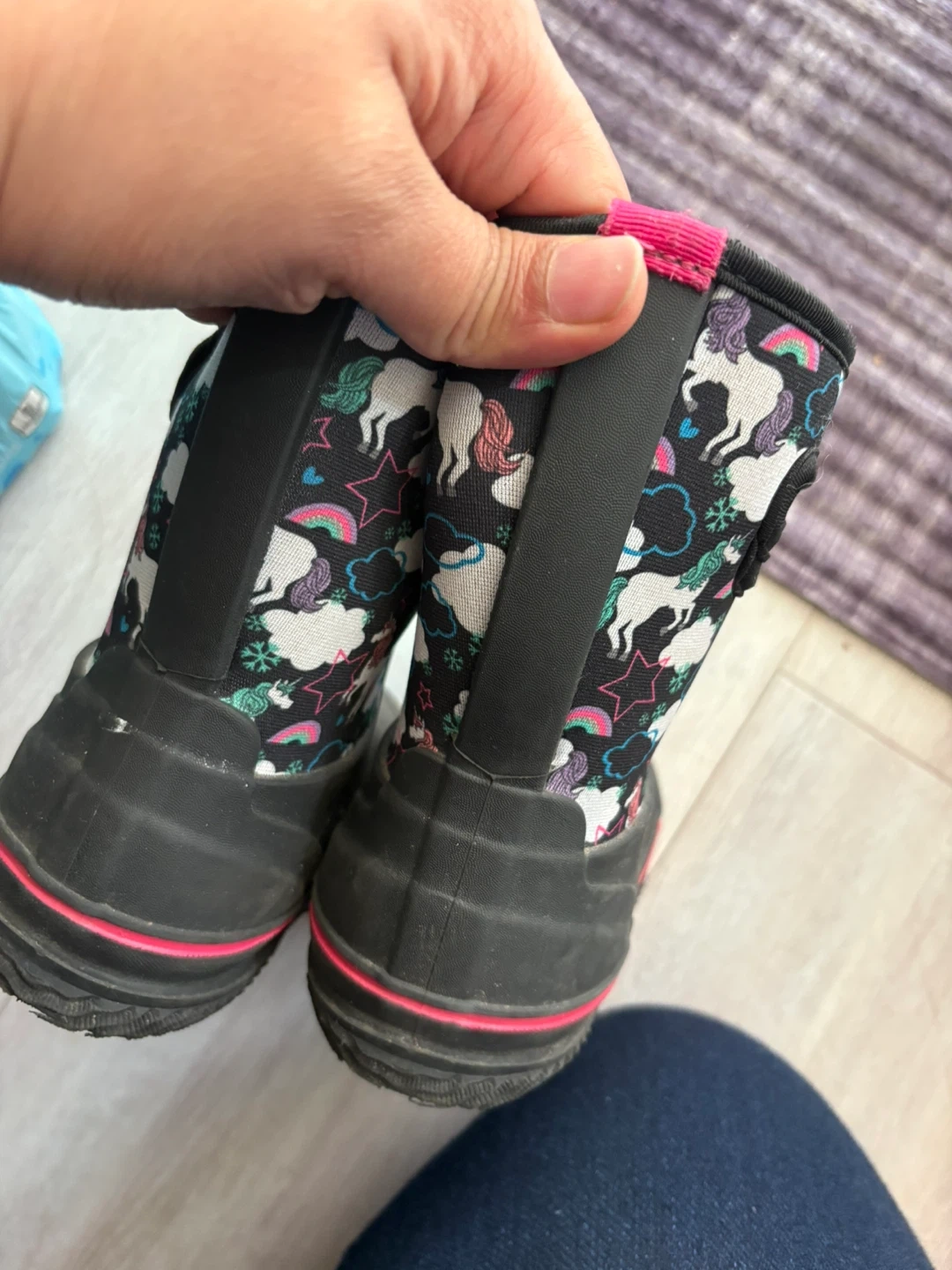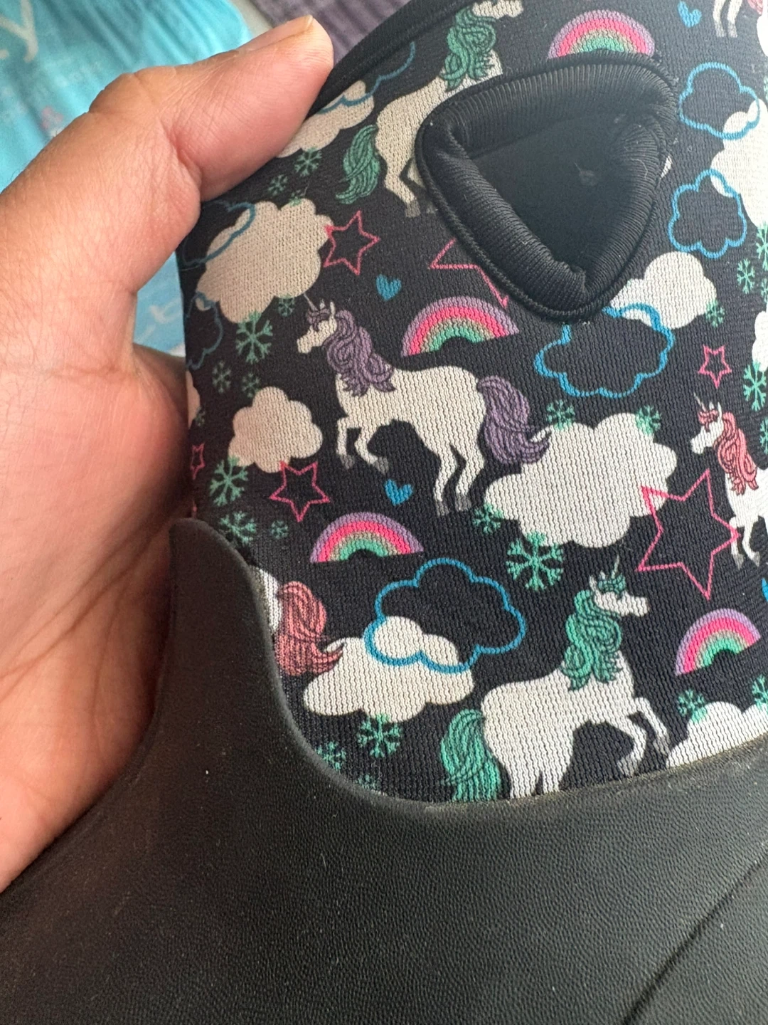Kids' "Unicorn Sky" boots from Bogs in a size 9. These boots have a textile and synthetic upper with a fun unicorn and cloud pattern. Easy pull-on handles.