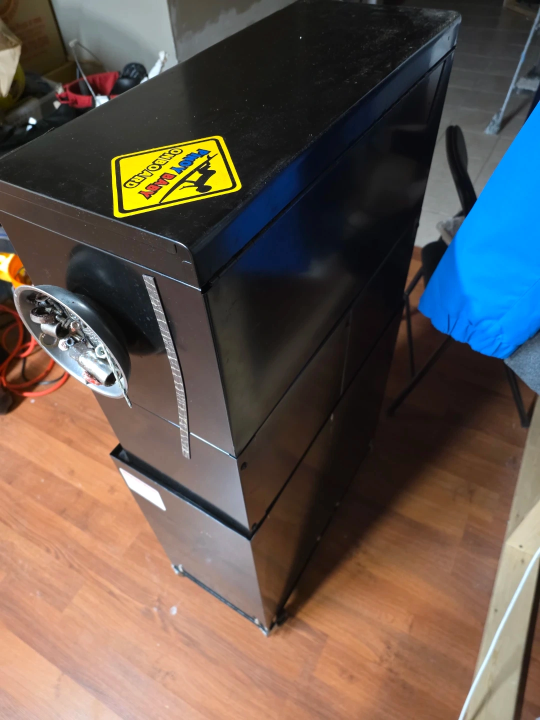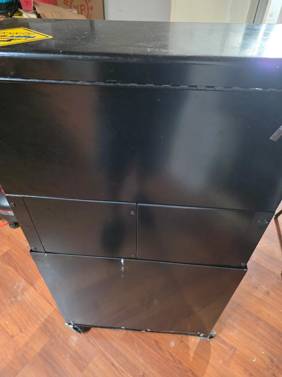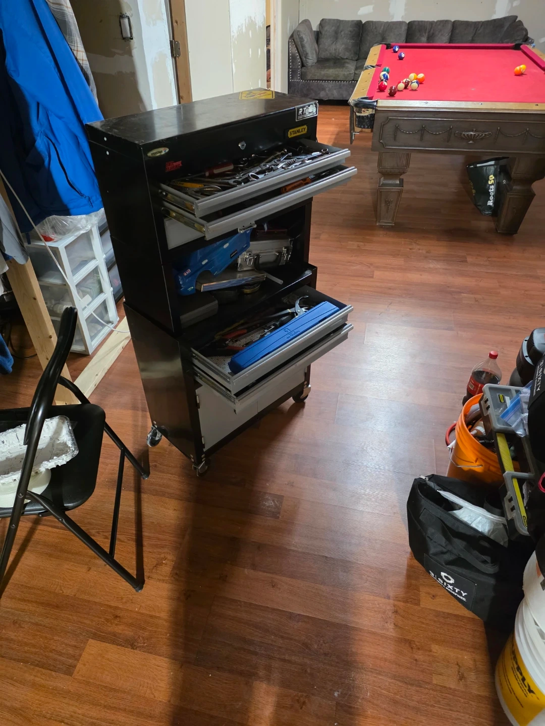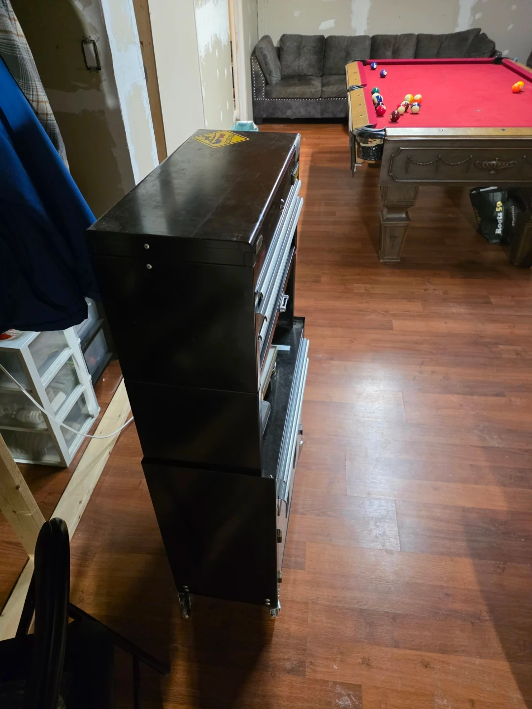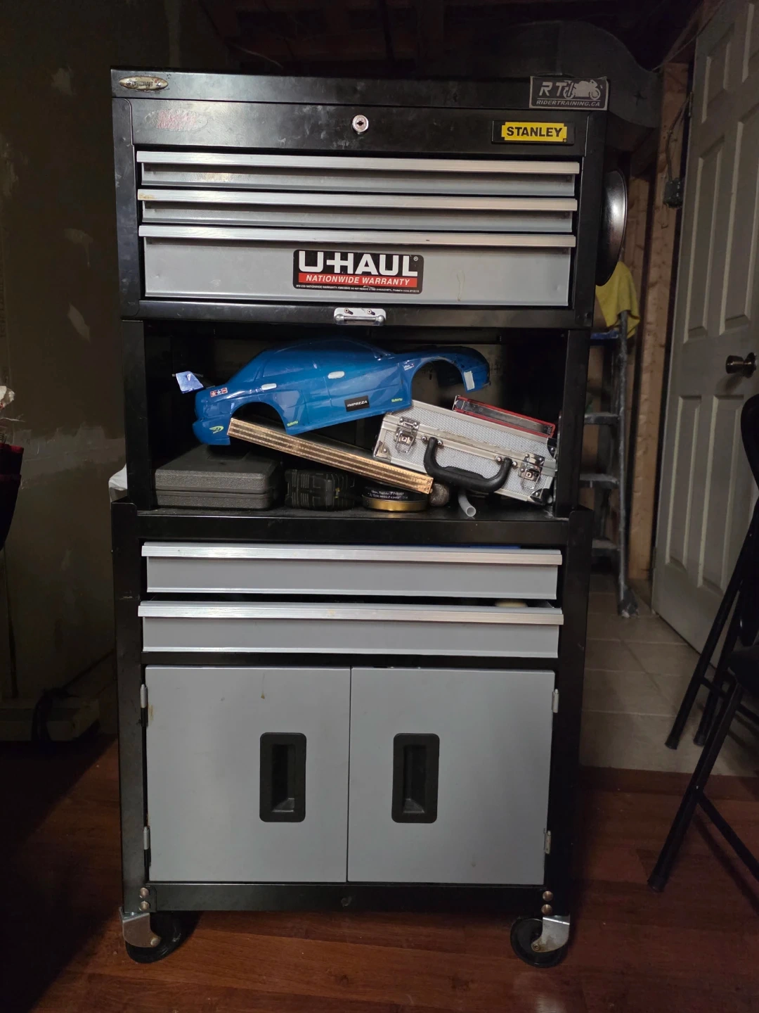 Black rolling tool chest with multiple drawers. Includes U-Haul branding on one drawer. Perfect for organizing tools and equipment. Items and tools in chest not included, no key for the top lock.
