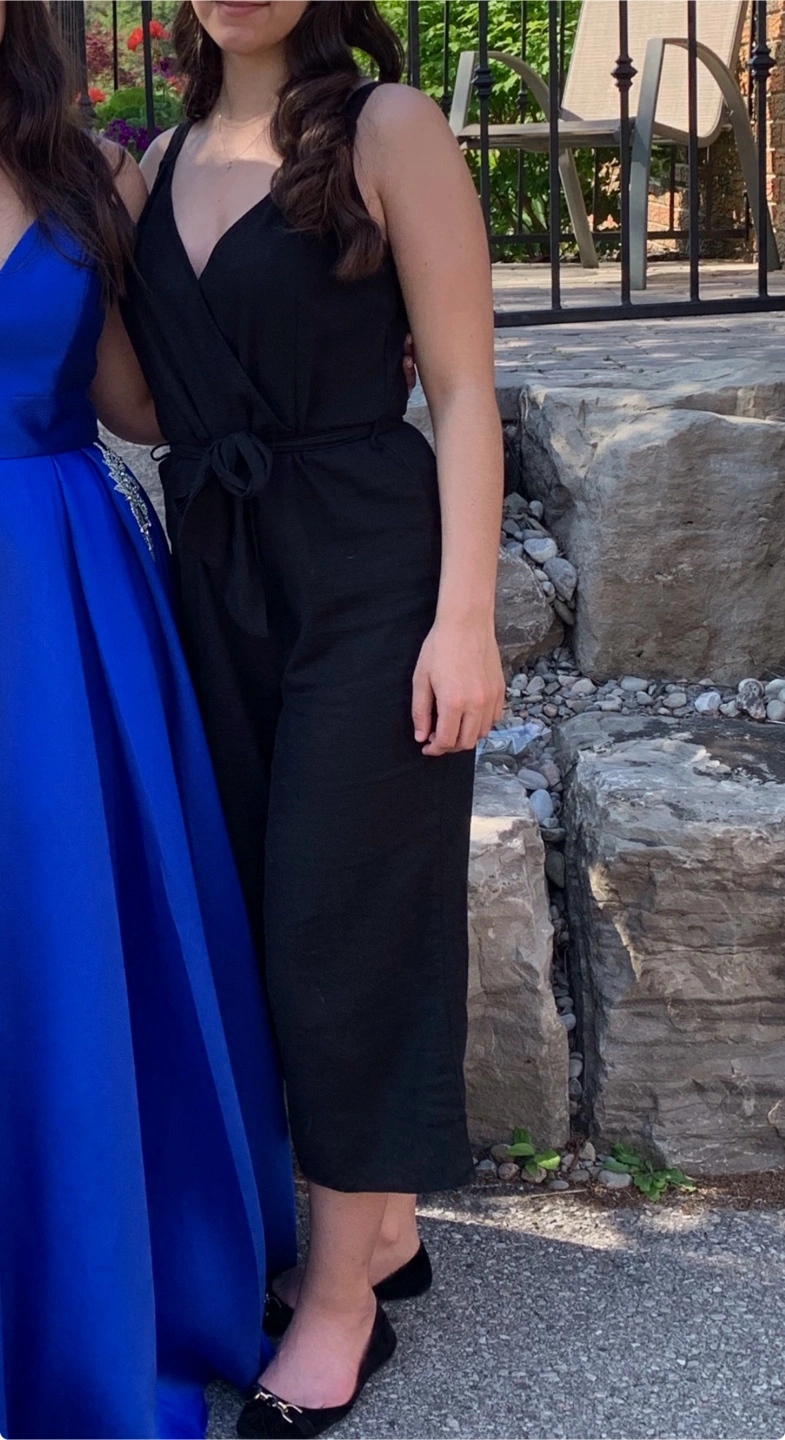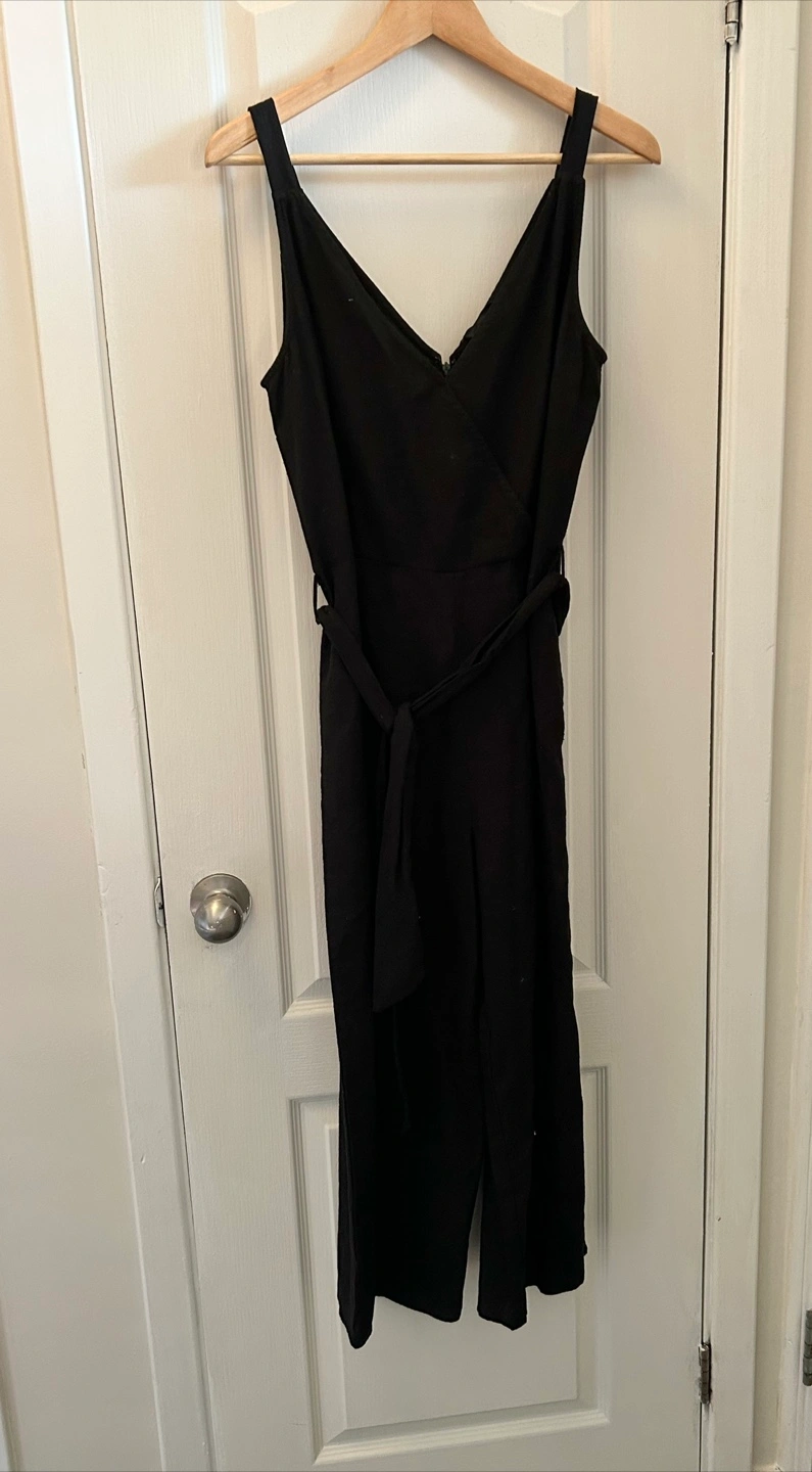 Cropped Black jumpsuit. Features a V-neck, tie waist, and wide leg style.