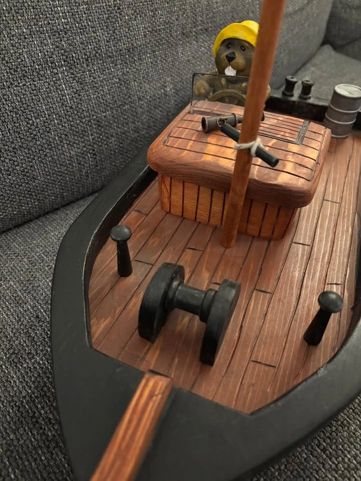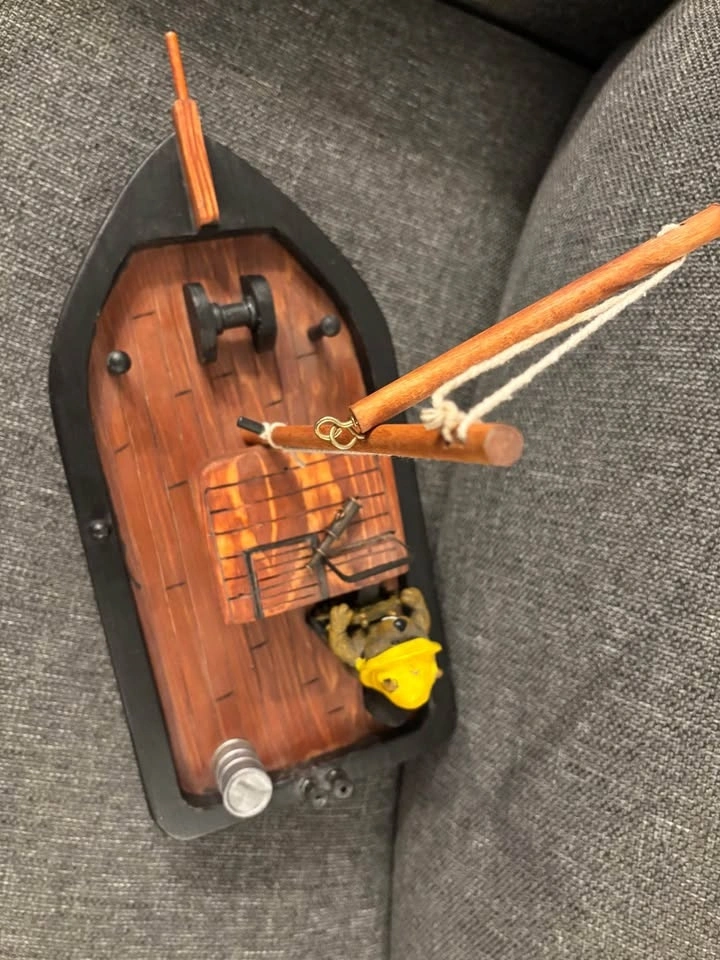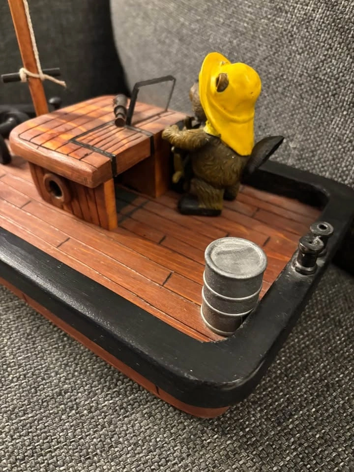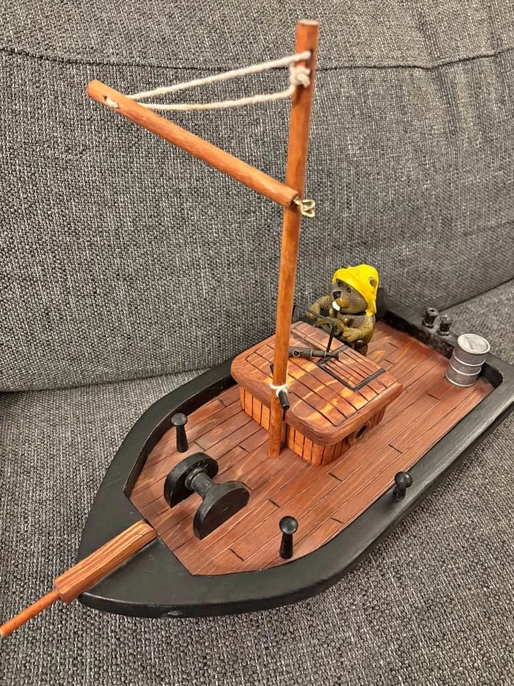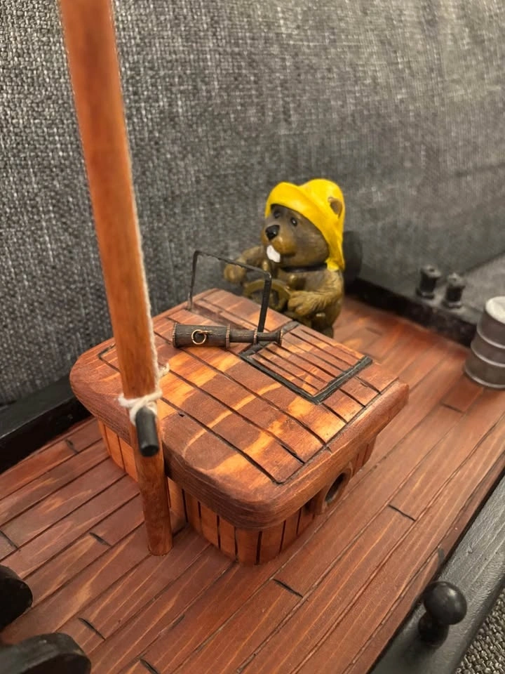 Fun and beautifully hand crafted folk art piece by local artist Lynn Lambert. Unique and one of a kind painted ship with beaver at the helm. Detailed construction of wood (ship hull and masts), metal (spyglass and wheel), glass (windscreen ), and painted clay or porcelain (beaver). Makes a great gift for an art lover or folk art enthusiast.