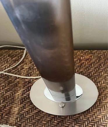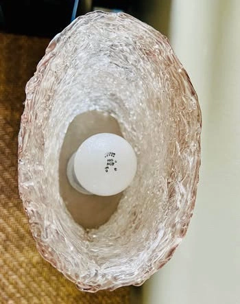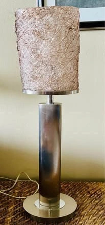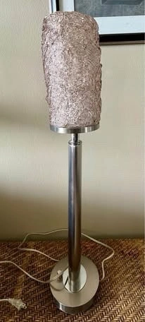 Stylish table lamp with a unique textured glass shade and a sleek brushed nickel base. This lamp provides a soft, ambient light perfect for any room. Material: Glass, Metal. Finish: Brushed Nickel. Dimensions: 27 inches height. Shade: Textured Glass. Switch: On/Off Switch. If the ad is up, it's still available!