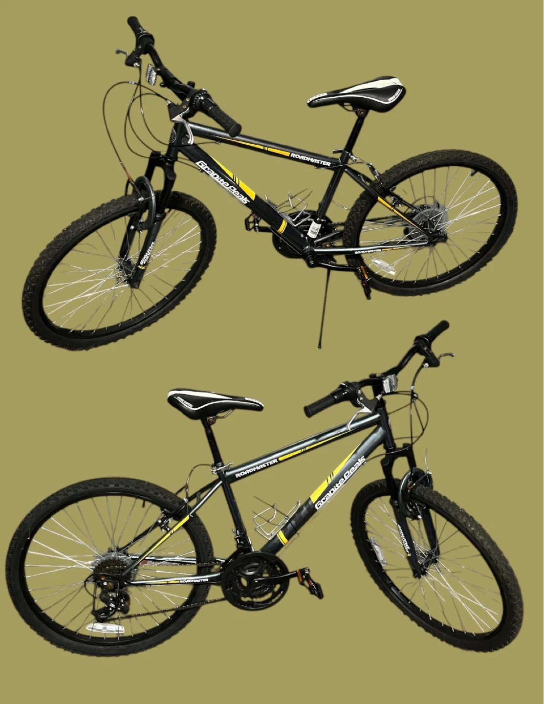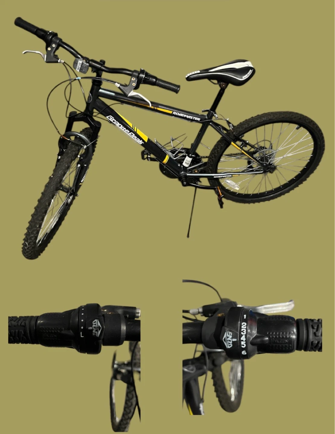 This is a black and yellow Roadmaster mountain bike. It features a front suspension fork and disc brakes. The gear shifters are on the handlebars for easy control. Great for trail riding!