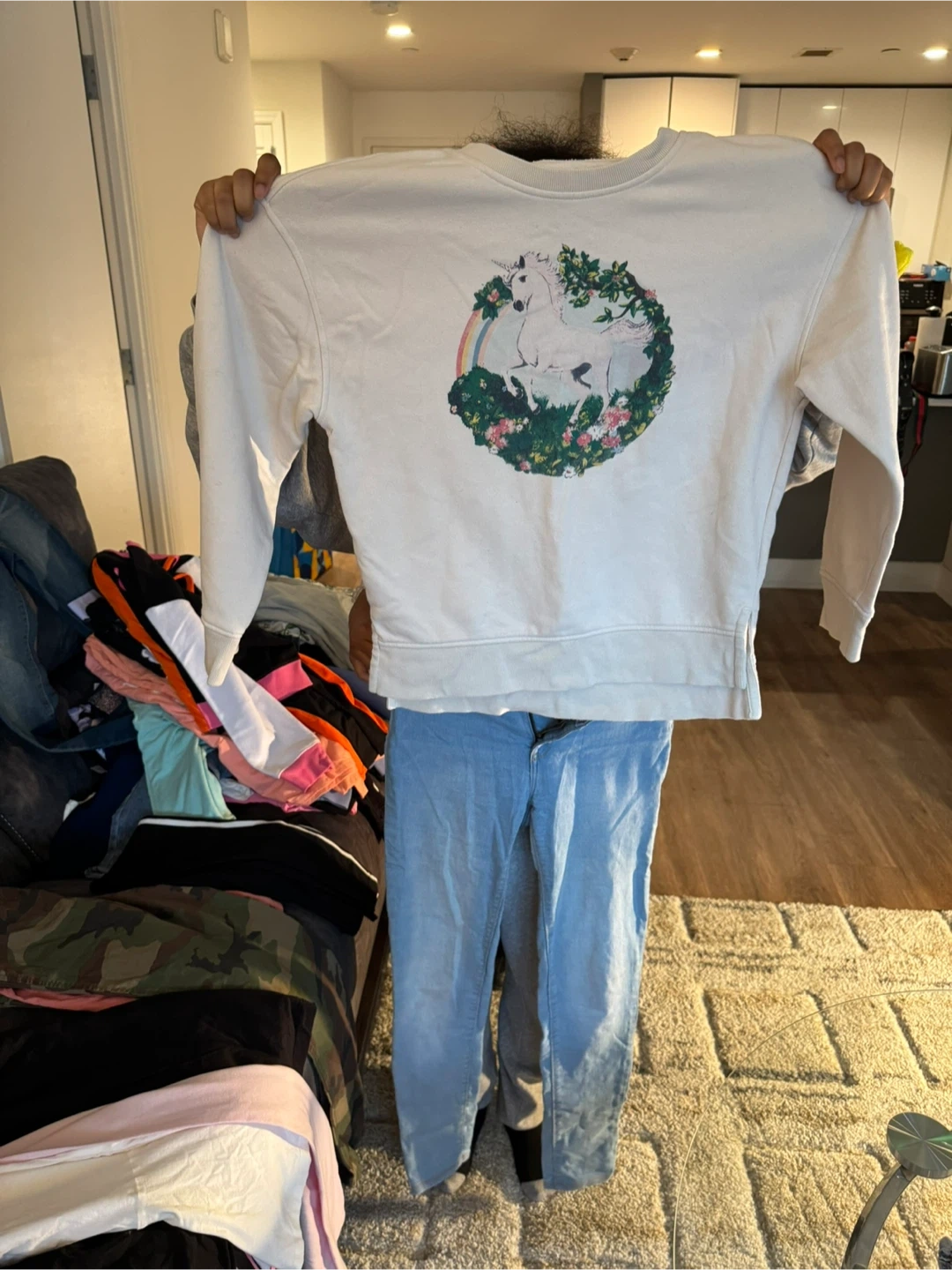 This white sweatshirt features a graphic of a unicorn surrounded by flowers and a rainbow. It's a long-sleeved crewneck with a comfortable fit and soft denim leggings to match Made from a soft fabric blend.Size 16