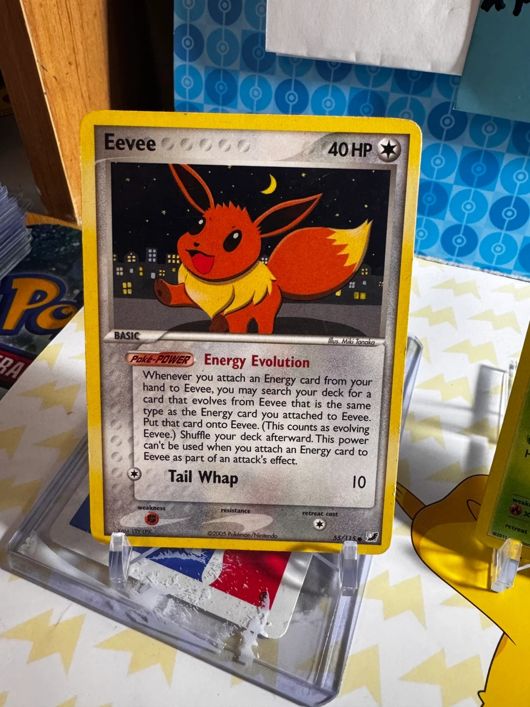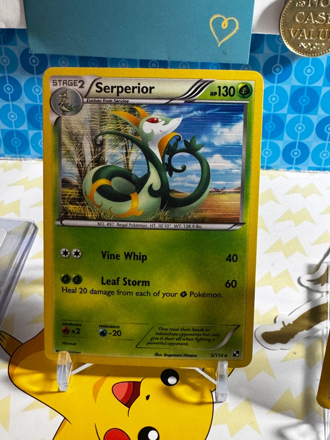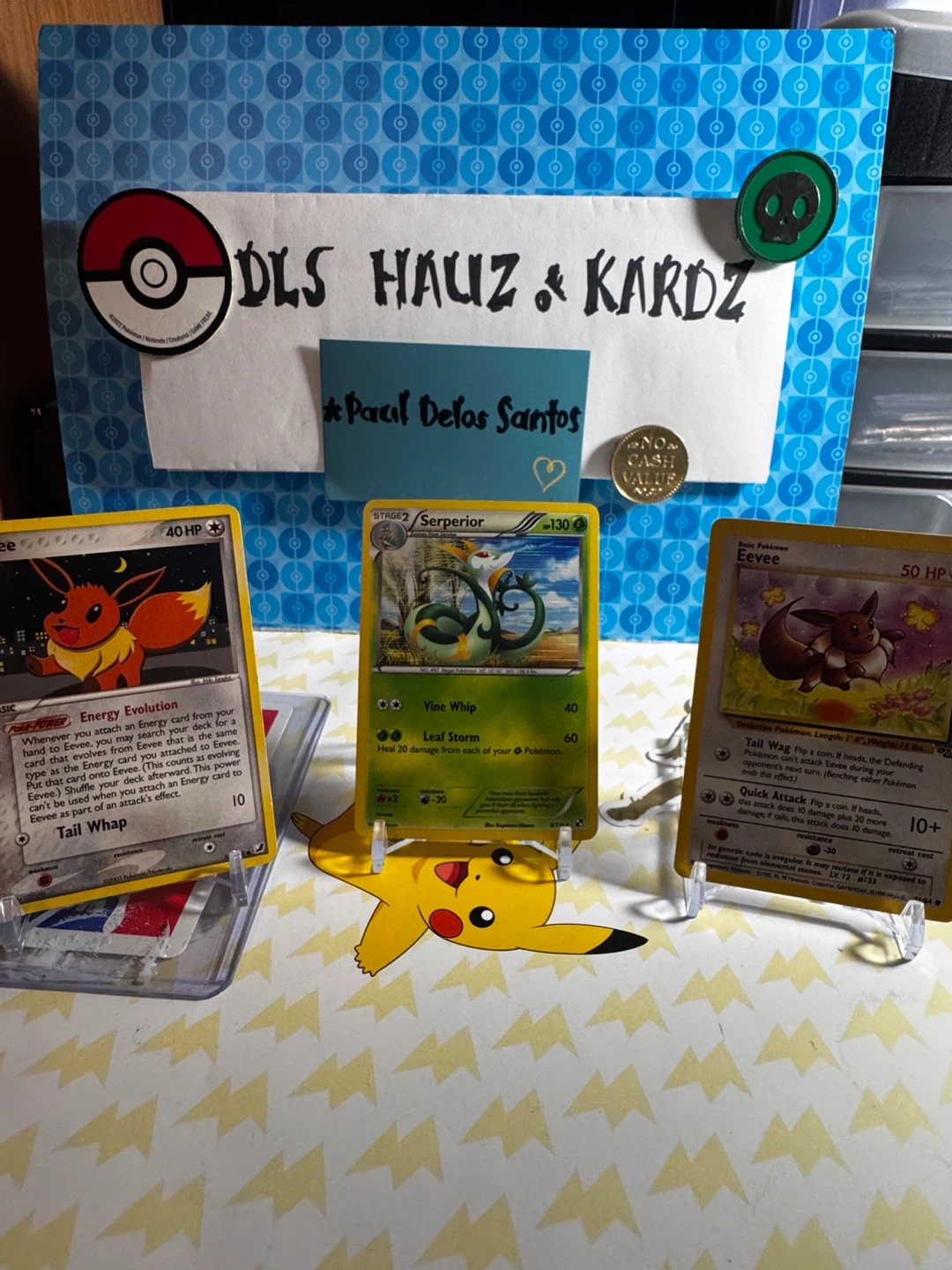 Collection of Pokemon trading cards featuring Serperior and two Eevee cards. These cards are from various sets and years.