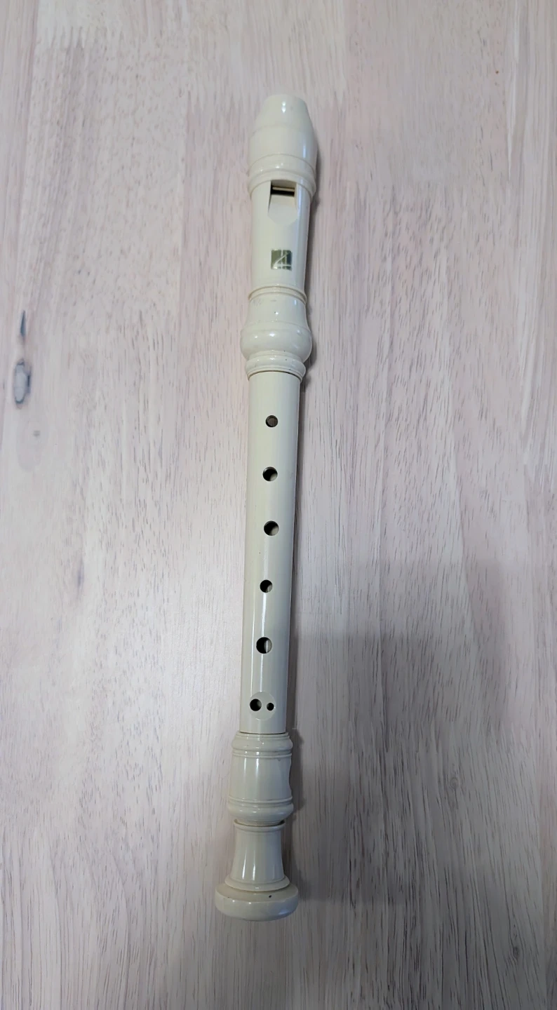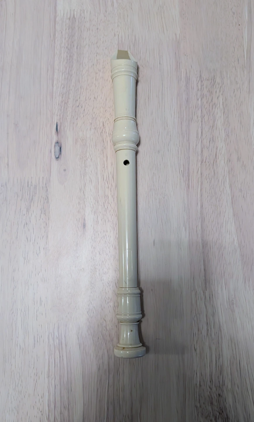This is a white recorder, a wind instrument perfect for music lessons. It has a cream-coloured finish and is made of plastic. This instrument is great for beginners learning to play music!