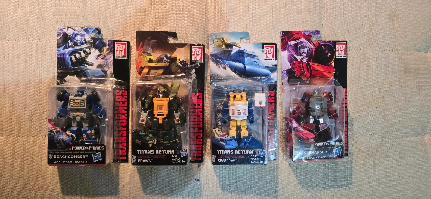 This is a lot of four Transformers action figures: Beachcomber, Brawn, Seaspray, and Windcharger. They're all from the Titans Return and Power of the Primes series. Each figure transforms into a vehicle and comes in its original packaging.