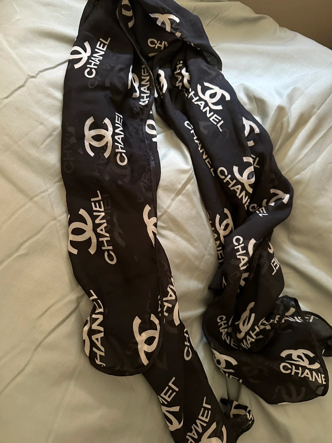 This is a black Chanel scarf with the signature CC logo pattern all over. It's made of lightweight material, perfect for adding a stylish touch to any outfit. This accessory would be great for accessorizing a spring or fall look.