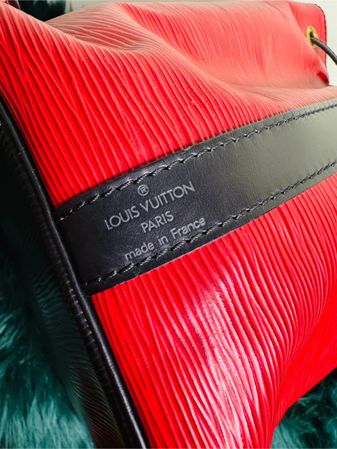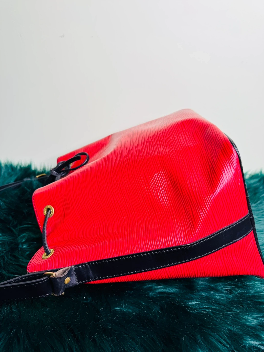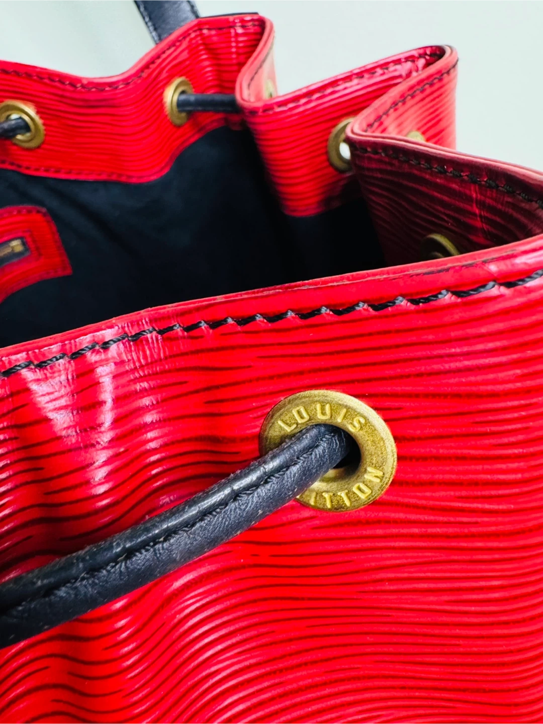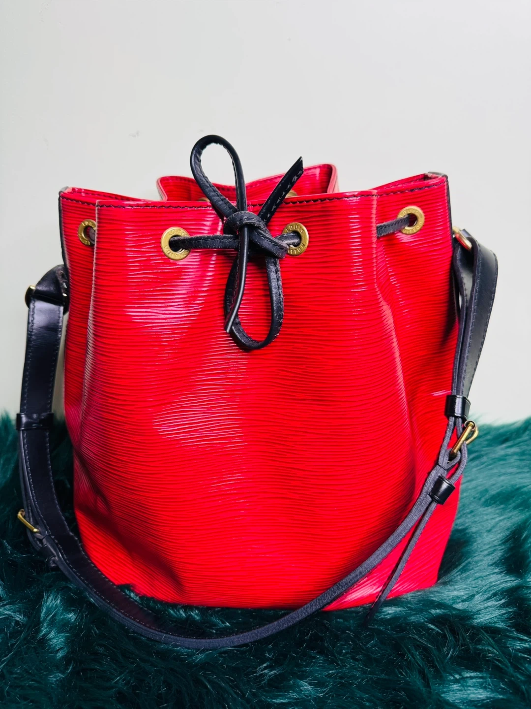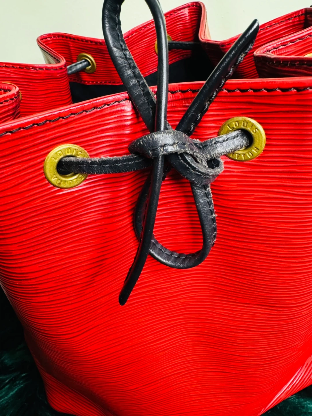 This is a Louis Vuitton Noé bucket bag in red Epi leather. It features a black leather drawstring closure and adjustable shoulder strap. This bag's classic design makes it a stylish accessory for everyday use.
