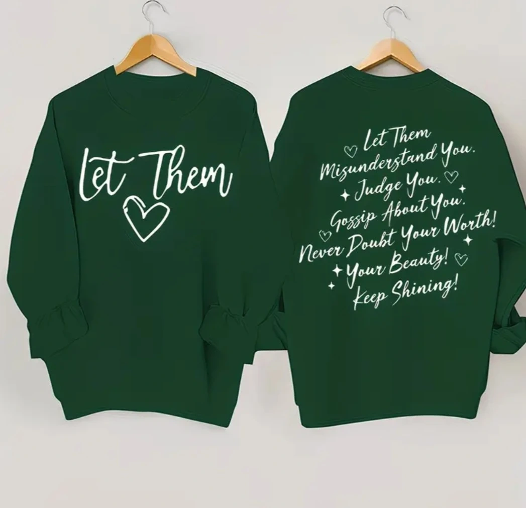 This graphic sweatshirt features the phrase "Let Them" on the front with a heart. The back has an inspirational message that reads "Let Them Misunderstand You. Judge You. Gossip About You. Never Doubt Your Worth! Your Beauty! Keep Shining!". It's a comfortable pullover style.