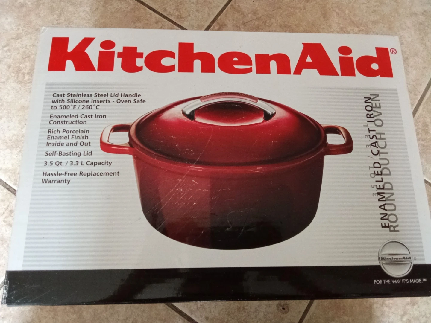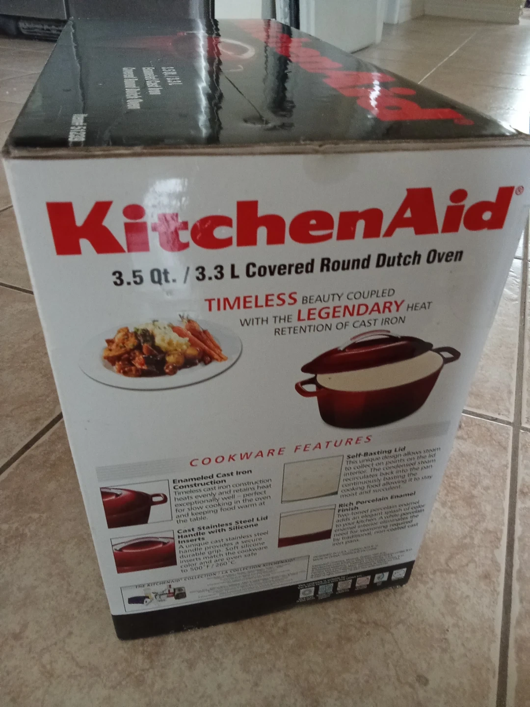 This KitchenAid Dutch oven is made with enameled cast iron construction. It has a rich porcelain enamel finish, inside and out. The cast stainless steel lid has silicone inserts and is oven safe to 500°F / 260°C. It offers self-basting capabilities. This cookware is perfect for slow cooking and braising.
