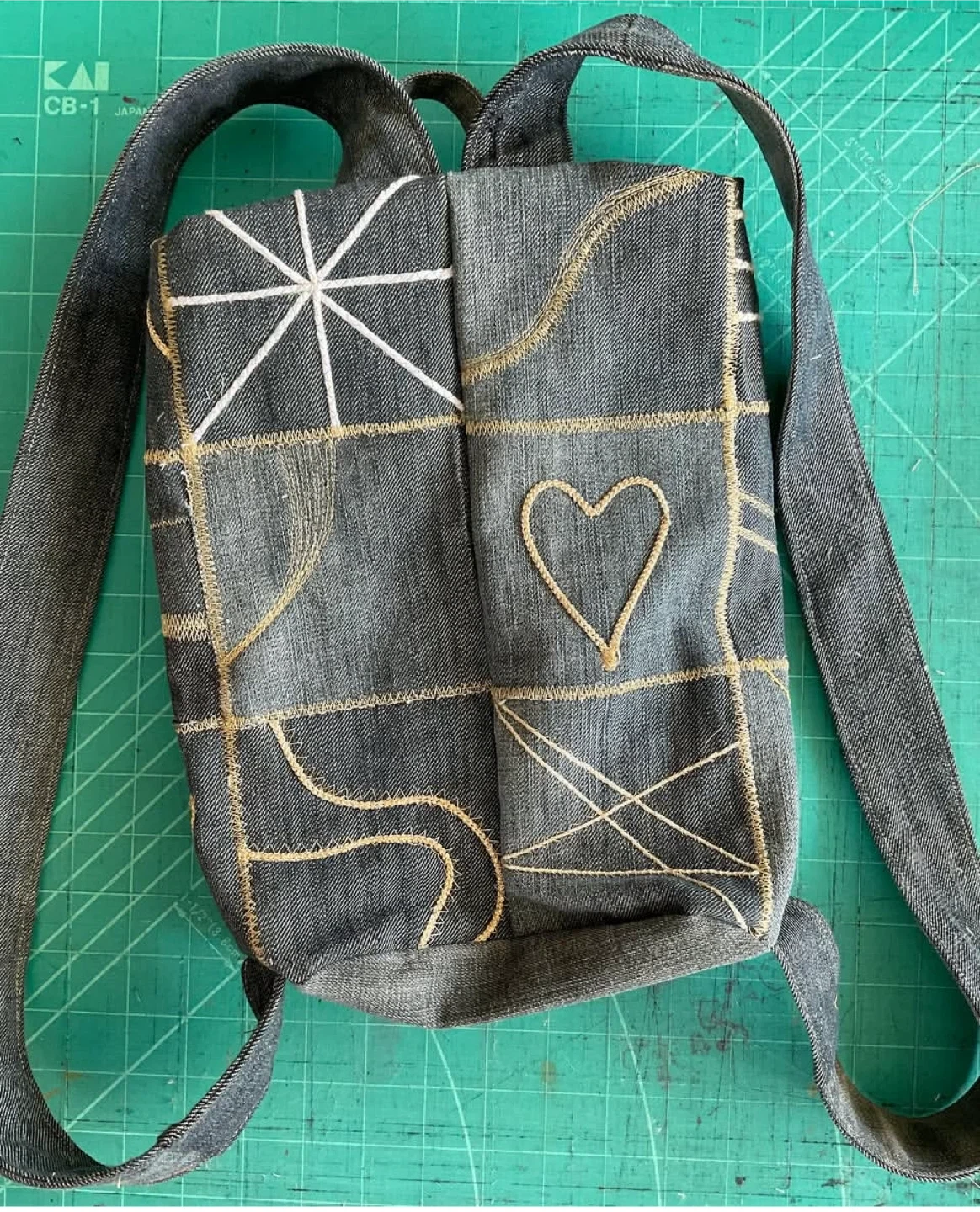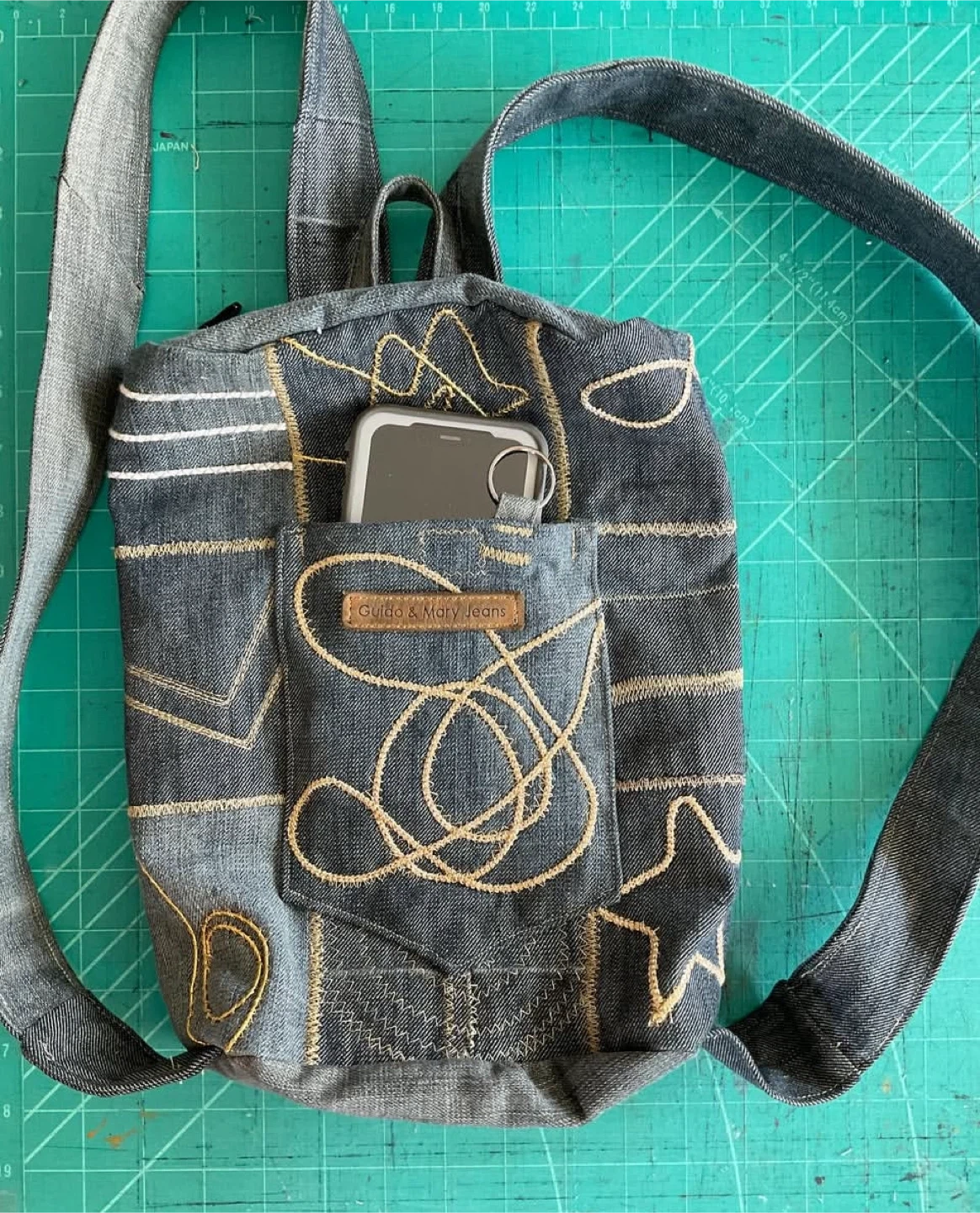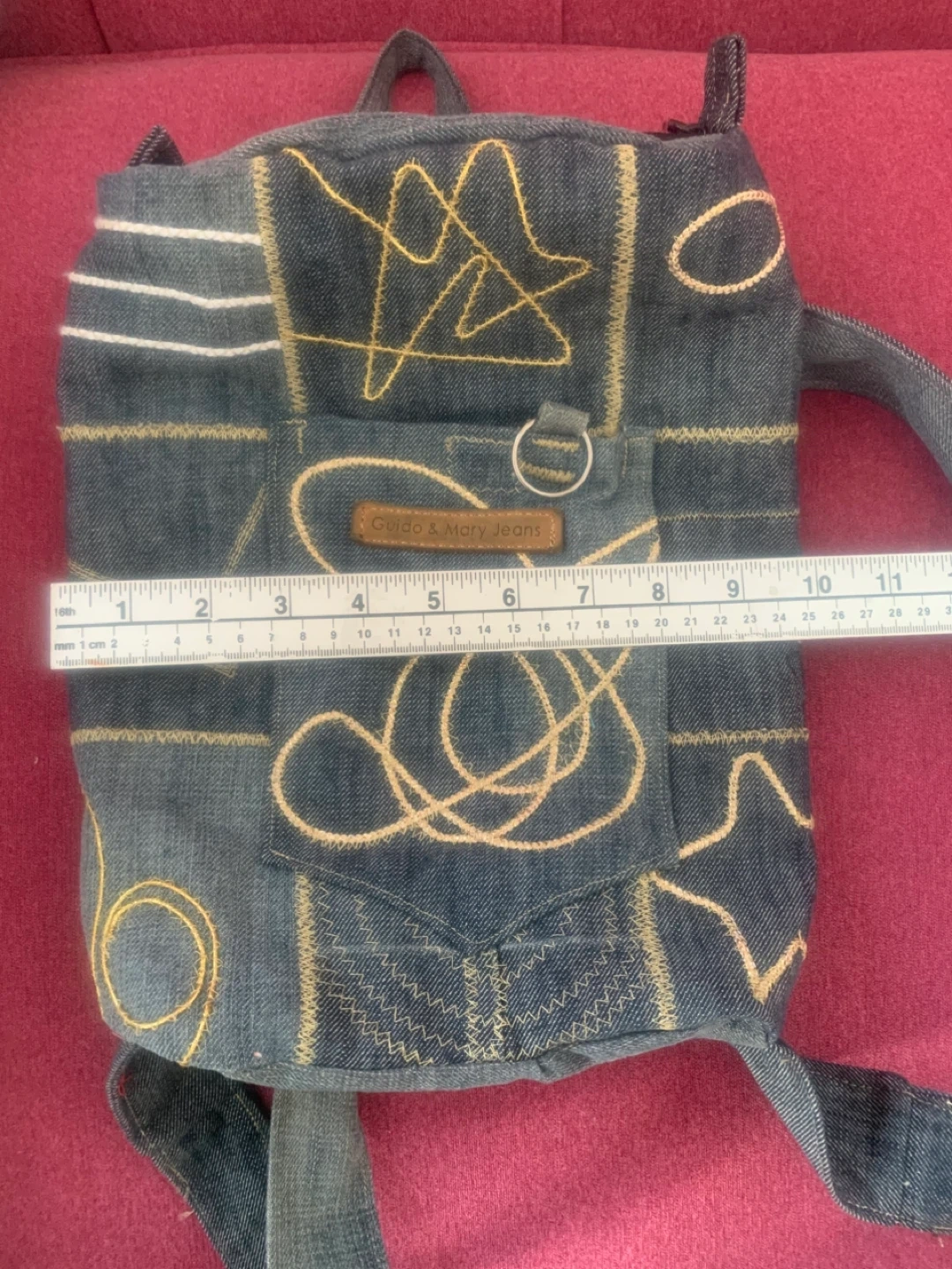 This is one of a kind unique denim patchwork backpack with embroidered gold cord. It has a front pocket that can fit a phone.
