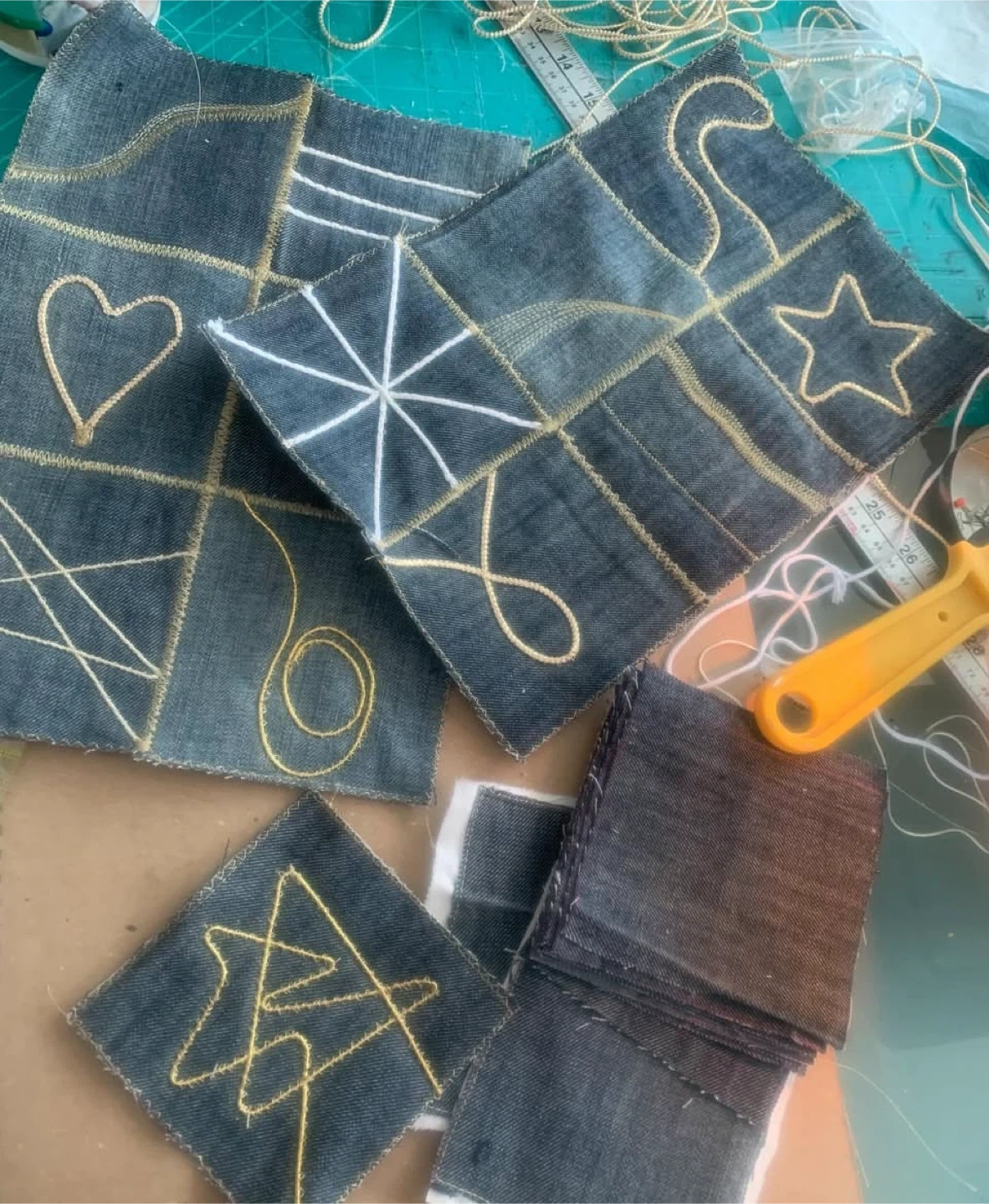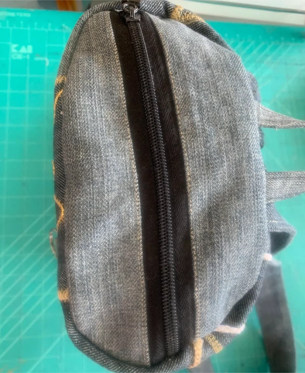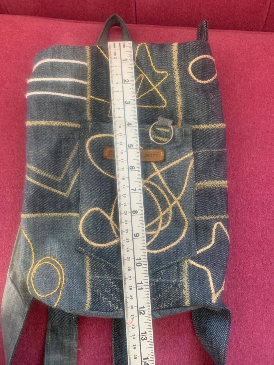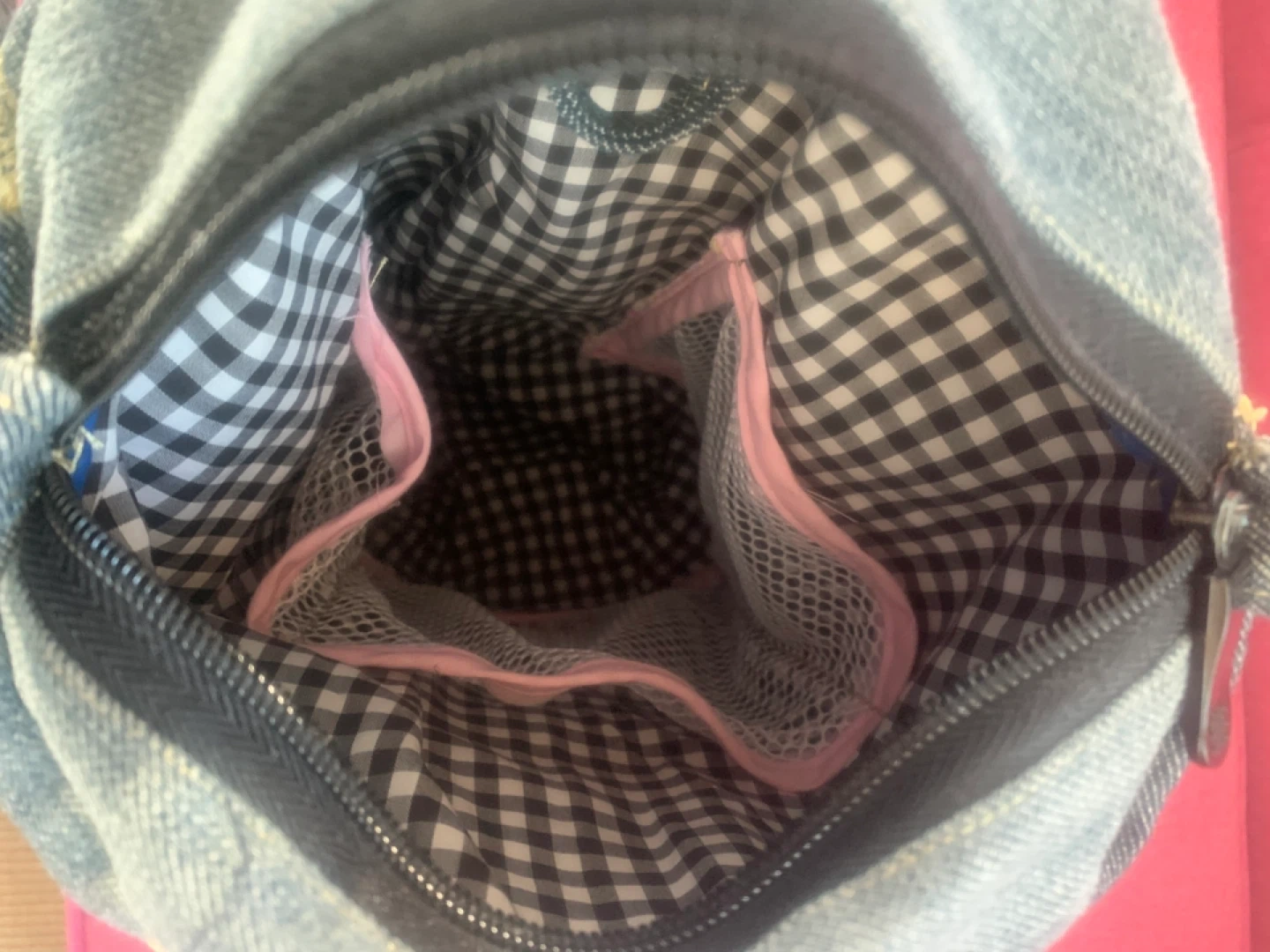 This is one of a kind unique denim patchwork backpack with embroidered gold cord. It has a front pocket that can fit a phone.