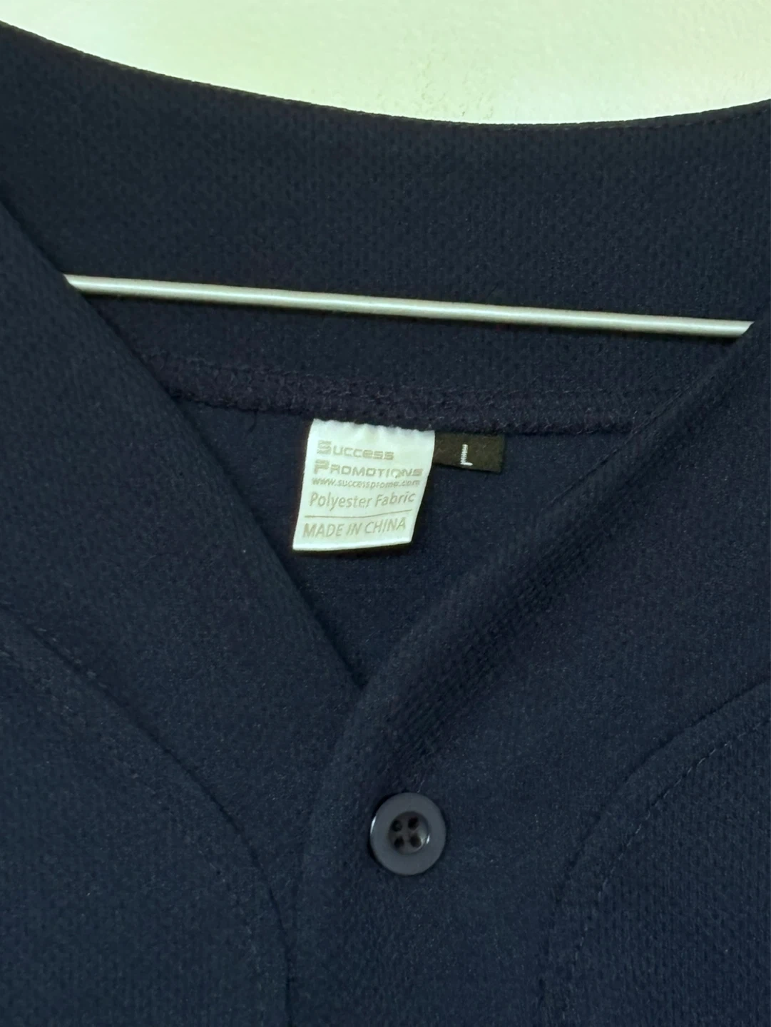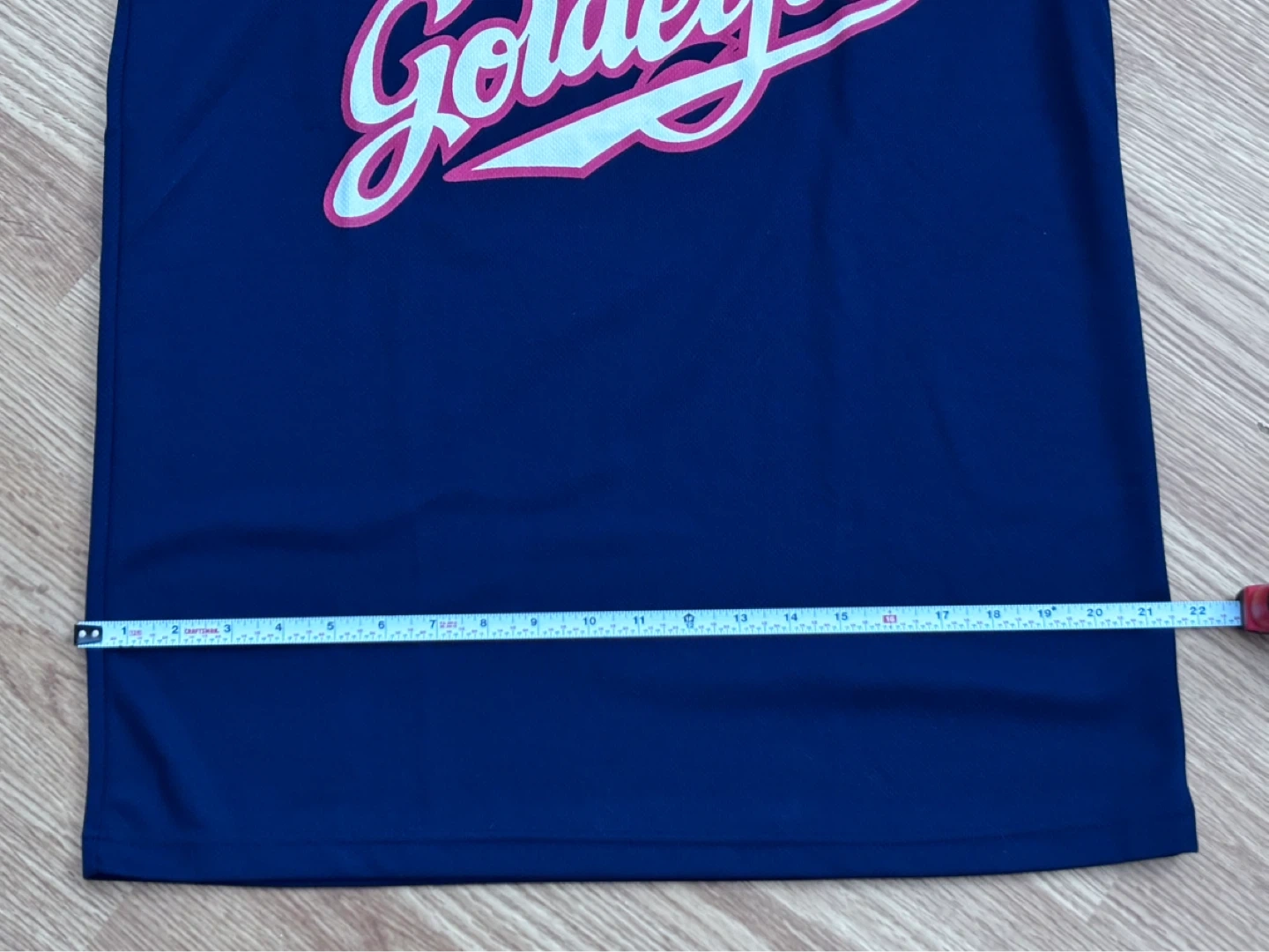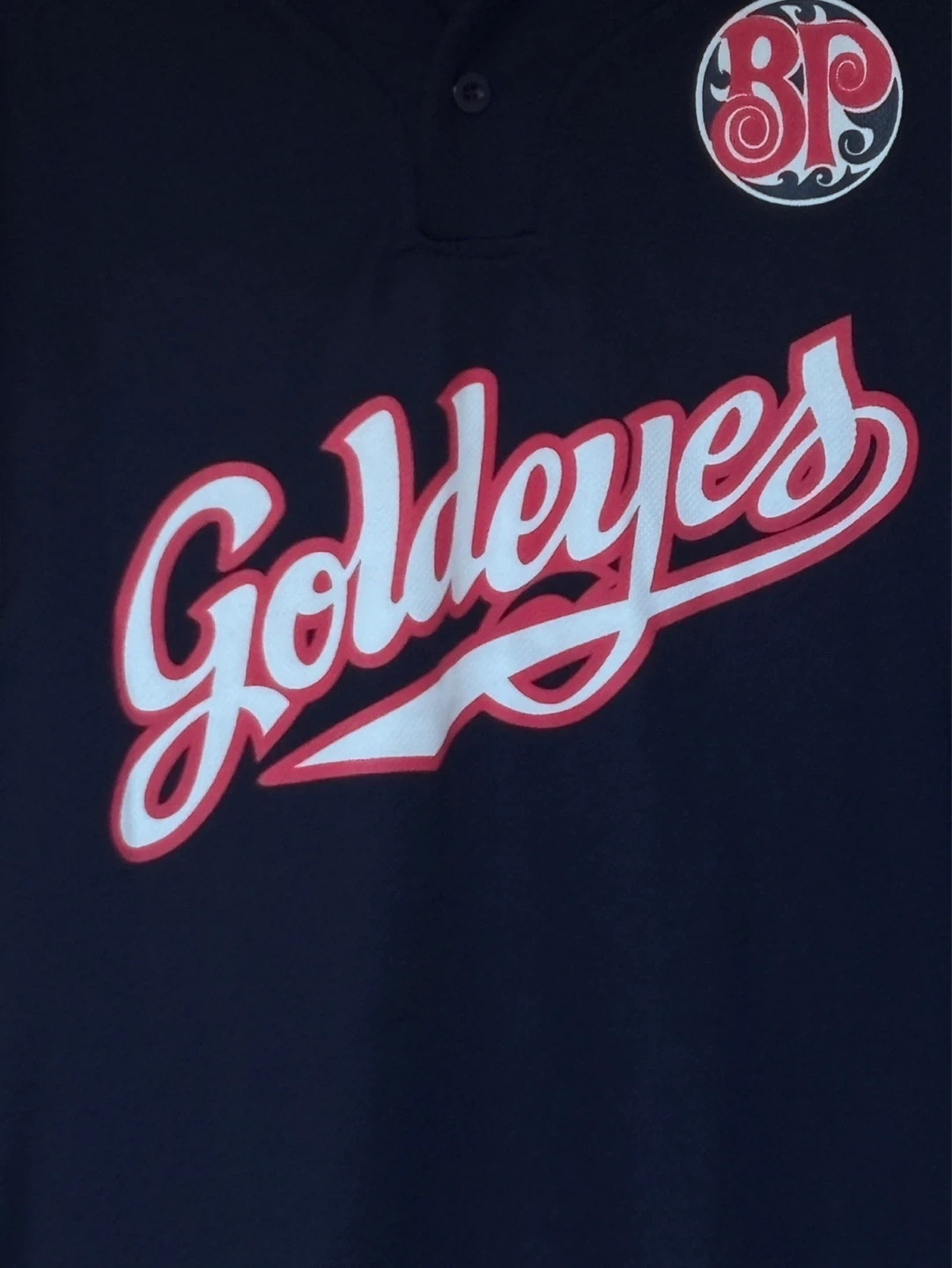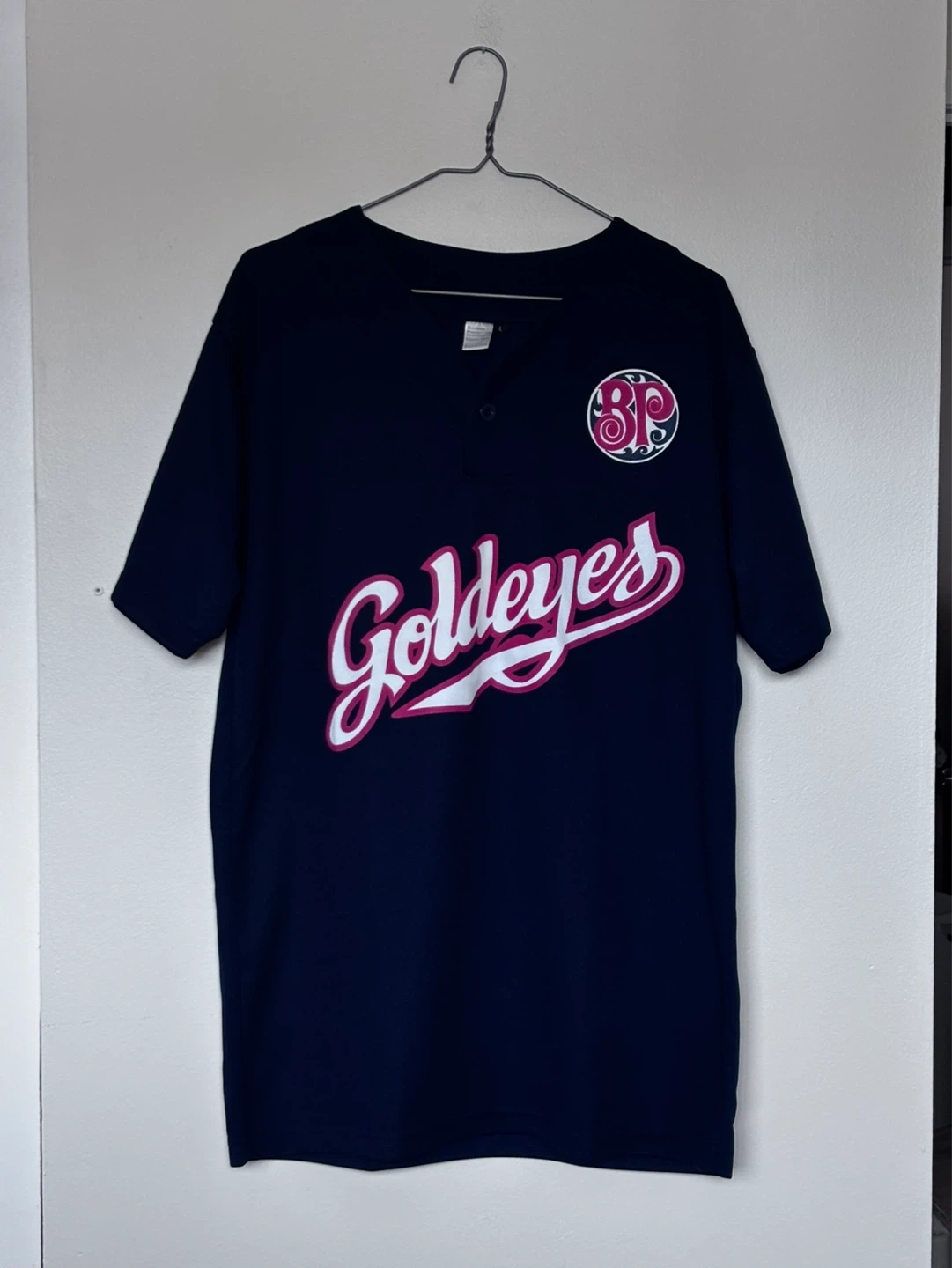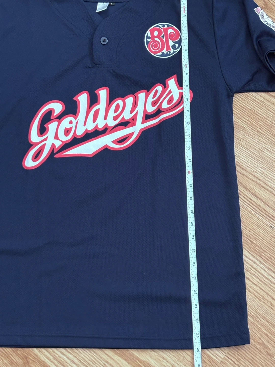 Navy blue Goldeyes baseball jersey. Size Large. Made from polyester fabric.