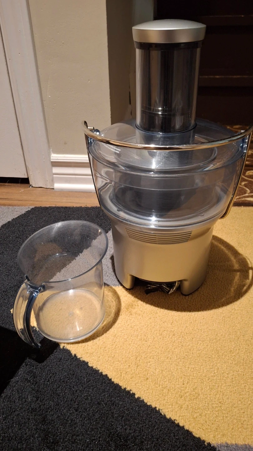 Breville Juice Fountain Compact juicer. It's silver and comes with the original box and manual. Juicer has a wide chute for large fruits and vegetables.
