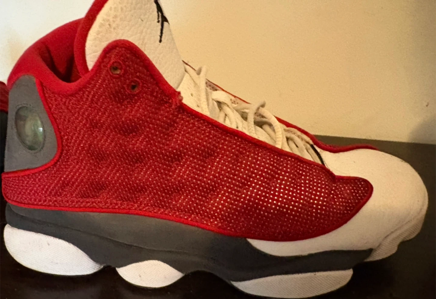 Men's Air Jordan 13 basketball shoes in a red and white colourway. Features a signature Jumpman logo on the tongue. These kicks are great for hitting the court or just for everyday wear! Small scuff on the toe of one good shoes still just seeing if there is any interest in them