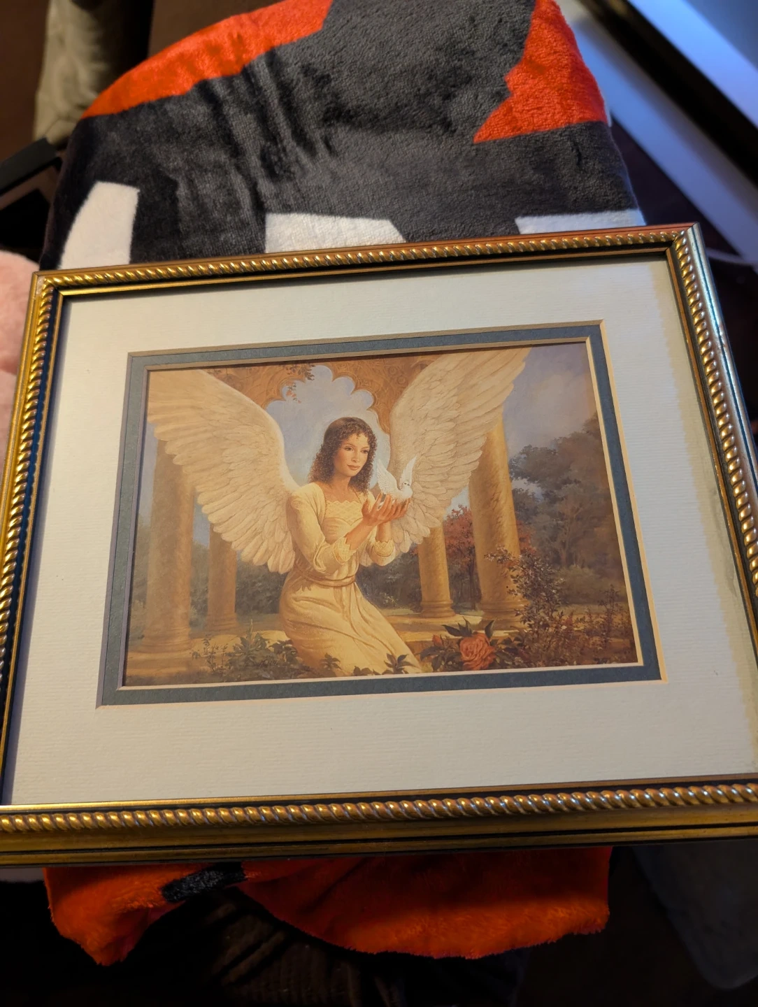 Framed art print featuring an angel holding a dove. It's presented in a gold-toned decorative frame with a mat. This piece would add a serene touch to any room.