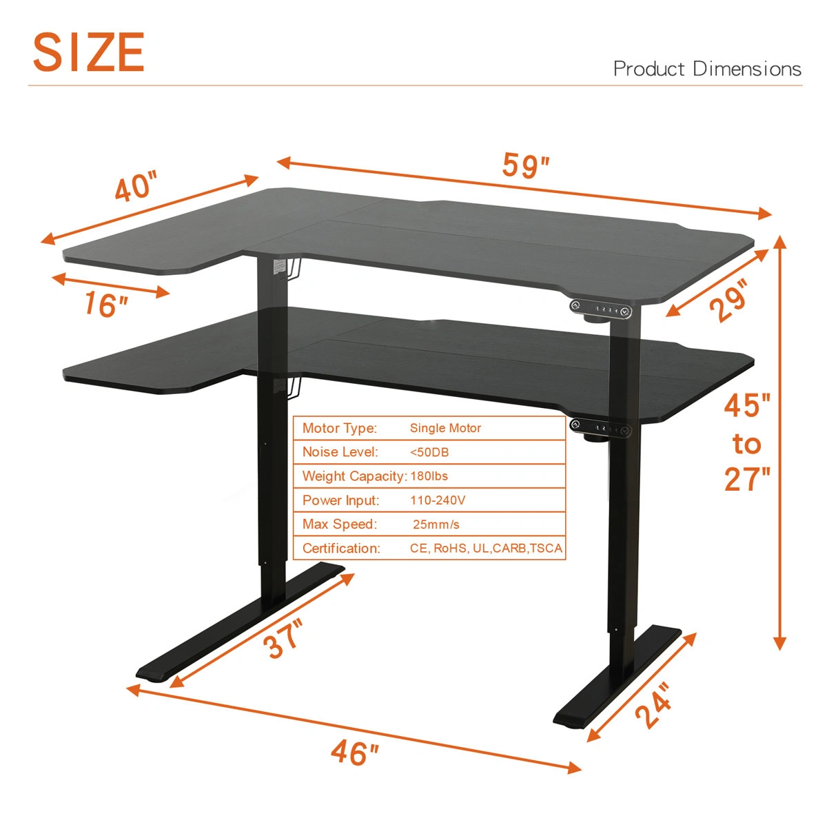 • Electric height adjustment (approx. 27”–45”)