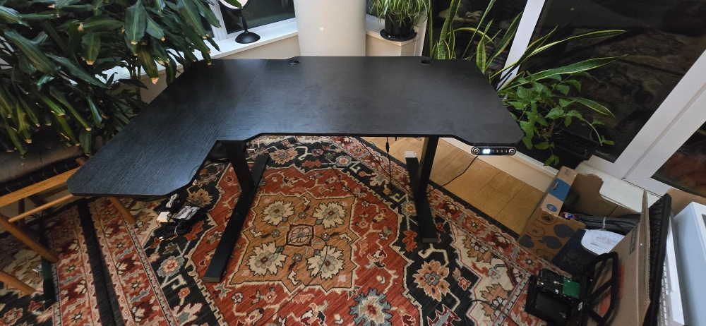 Selling a gently used L-shaped height-adjustable desk in excellent working condition. Perfect for a home office or professional workspace. The spacious corner design easily fits dual monitors, a laptop, a keyboard, and accessories.