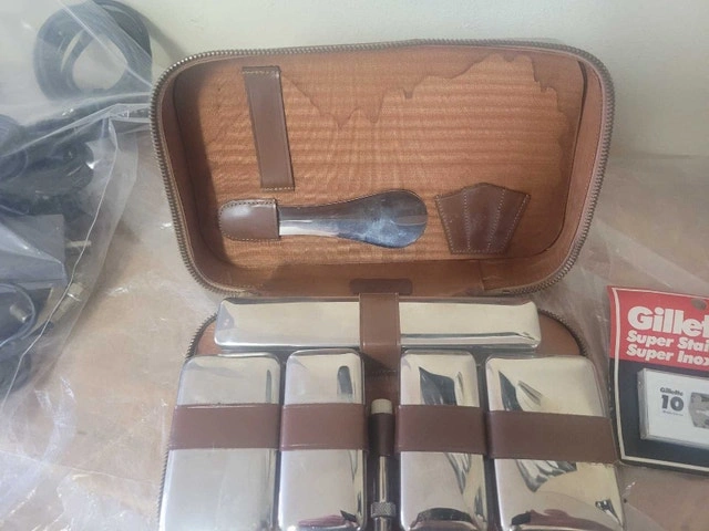 For sell is this Vintage Mens Travel Grooming Kit Vanity Case Set in Leather Brown Zipper Case. There is a few pieces missing comb and nail kit . The rest of the set is new including a pack of new razor blades asking $30 pick up on beaverbrook lane Kanata thank you