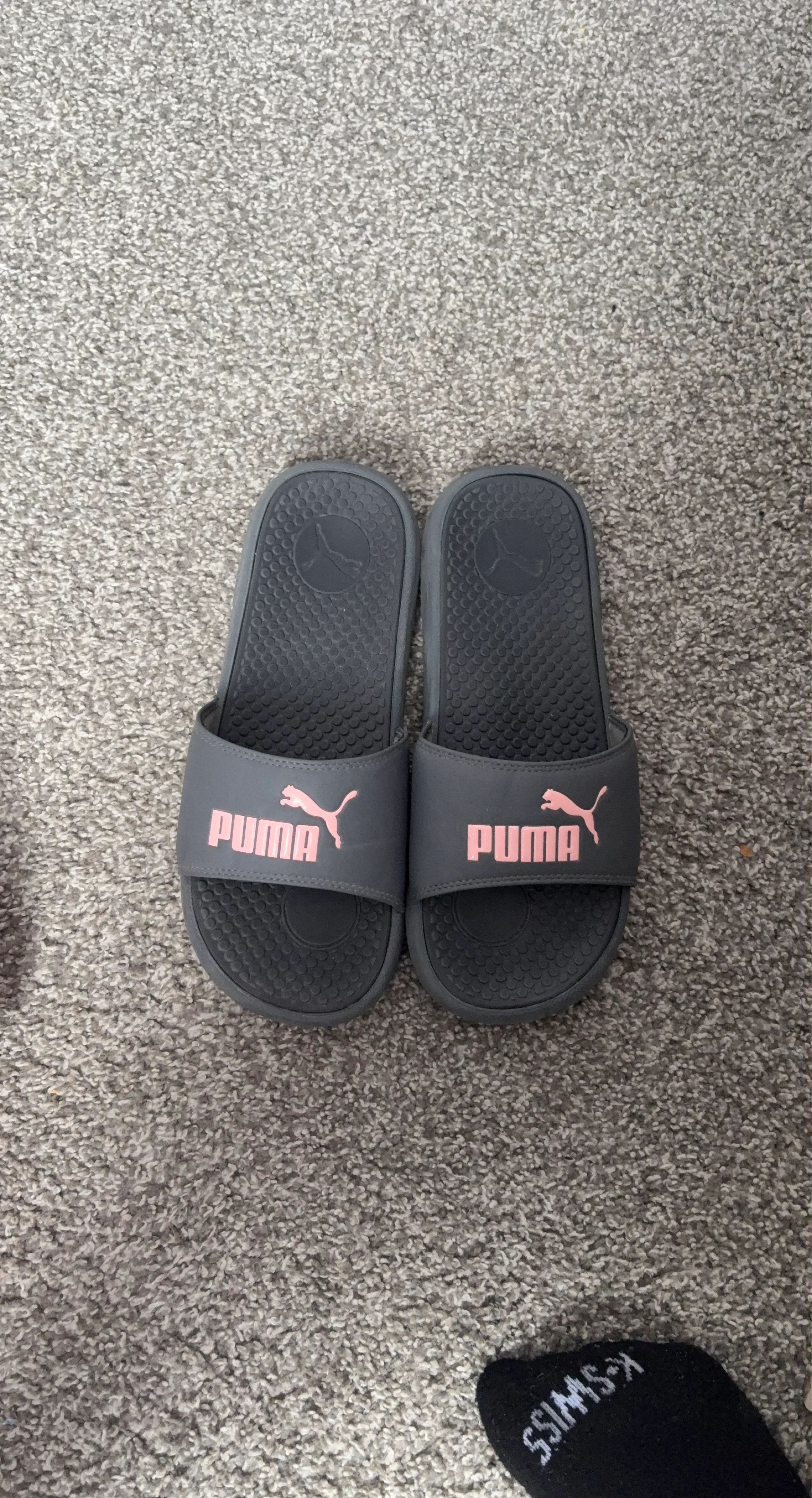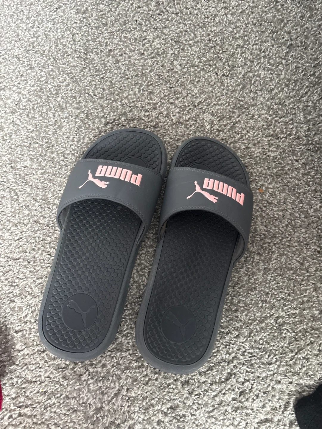 Puma slides in grey with pink detailing. Comfortable and easy to slip on for casual wear. Perfect for lounging or post-workout.