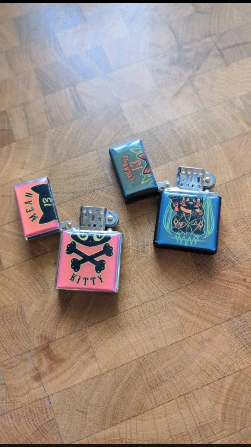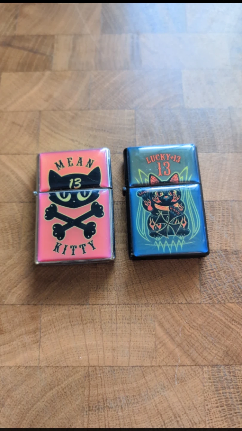2 refillable lighters with unique designs. Two feature cat-themed graphics, one says 'Mean Kitty' and the other 'Lucky 13'. They're great for collectors or everyday use.