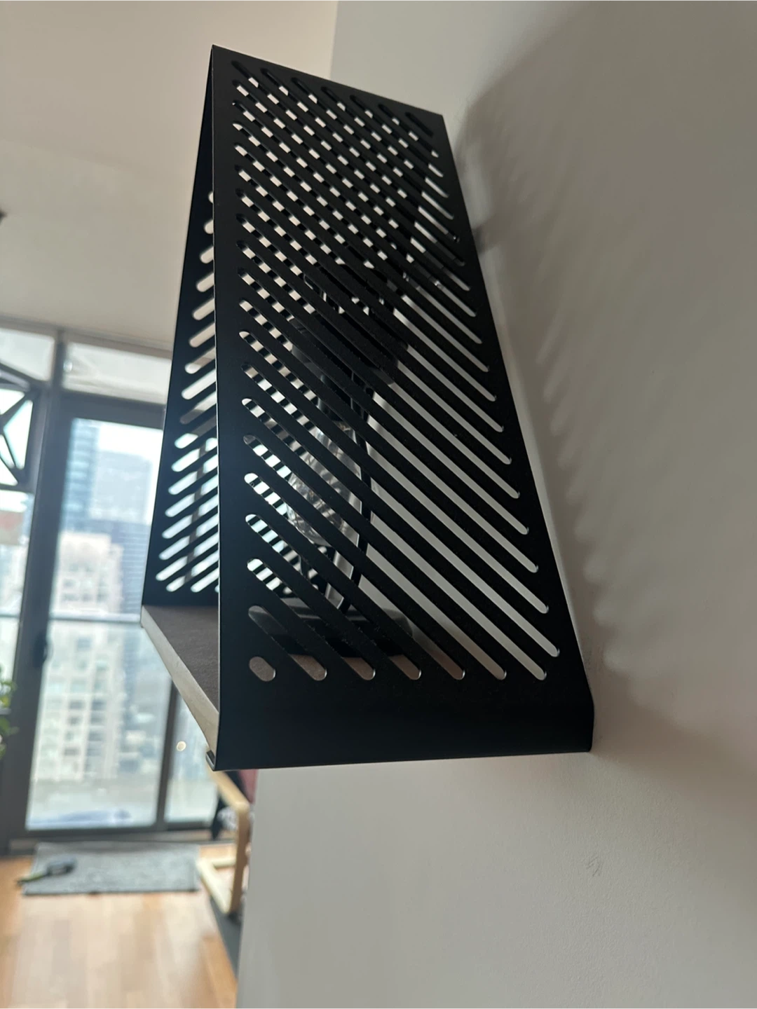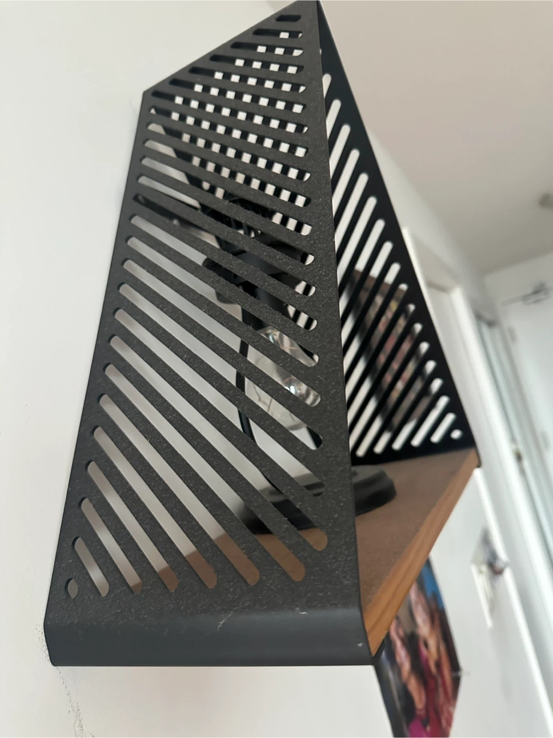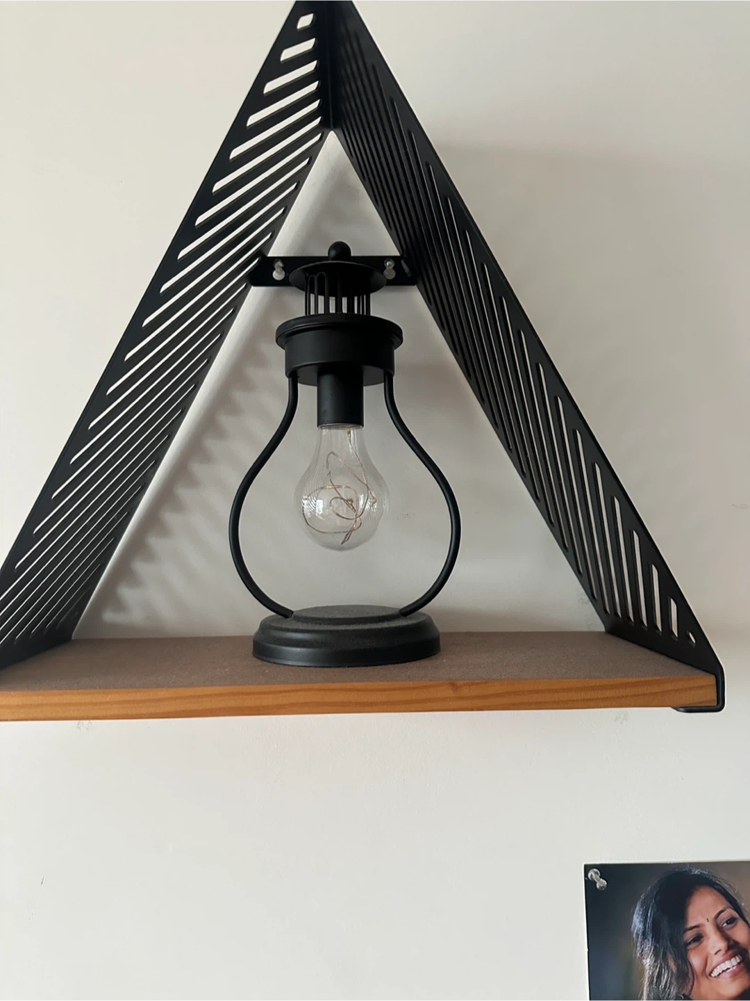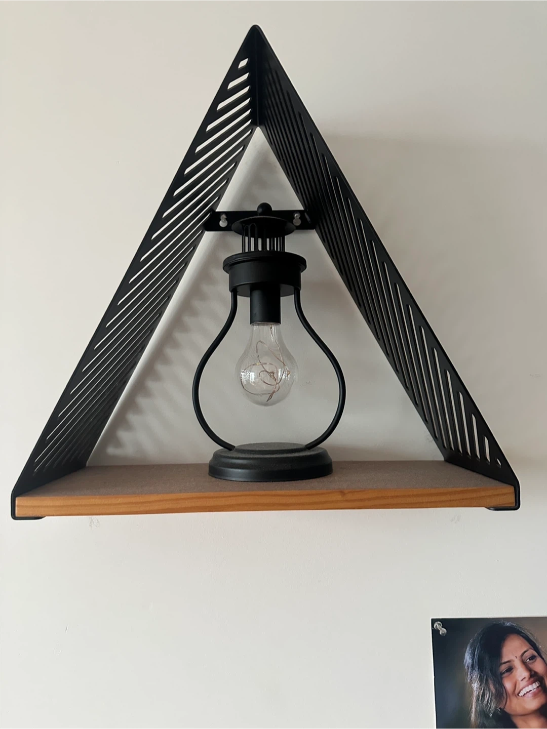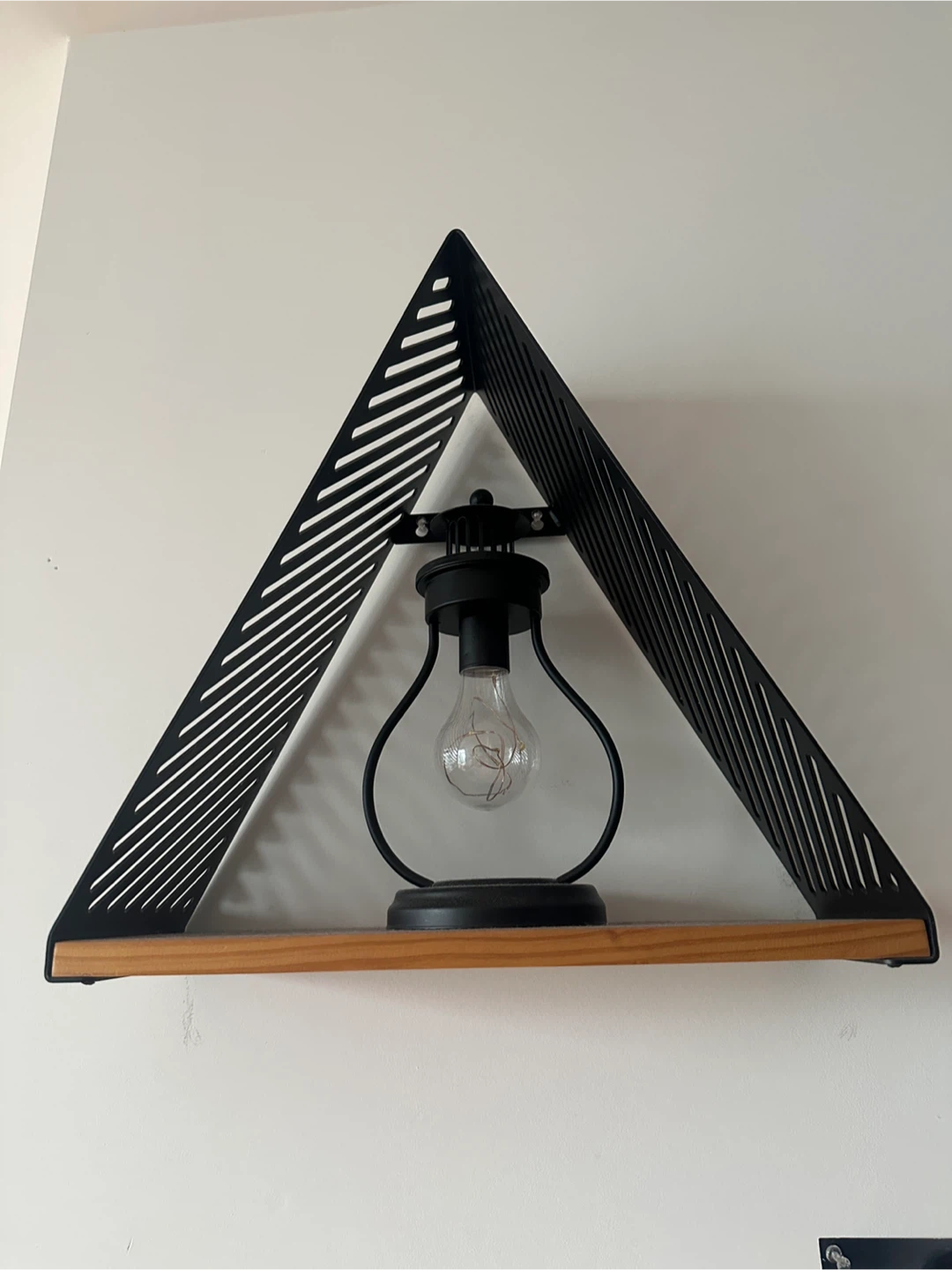 This beautiful unique triangular wall shelf features a decorative black metal frame and a wooden shelf. It's designed to hold a light bulb for ambient lighting. This piece adds a modern, industrial touch to any room.