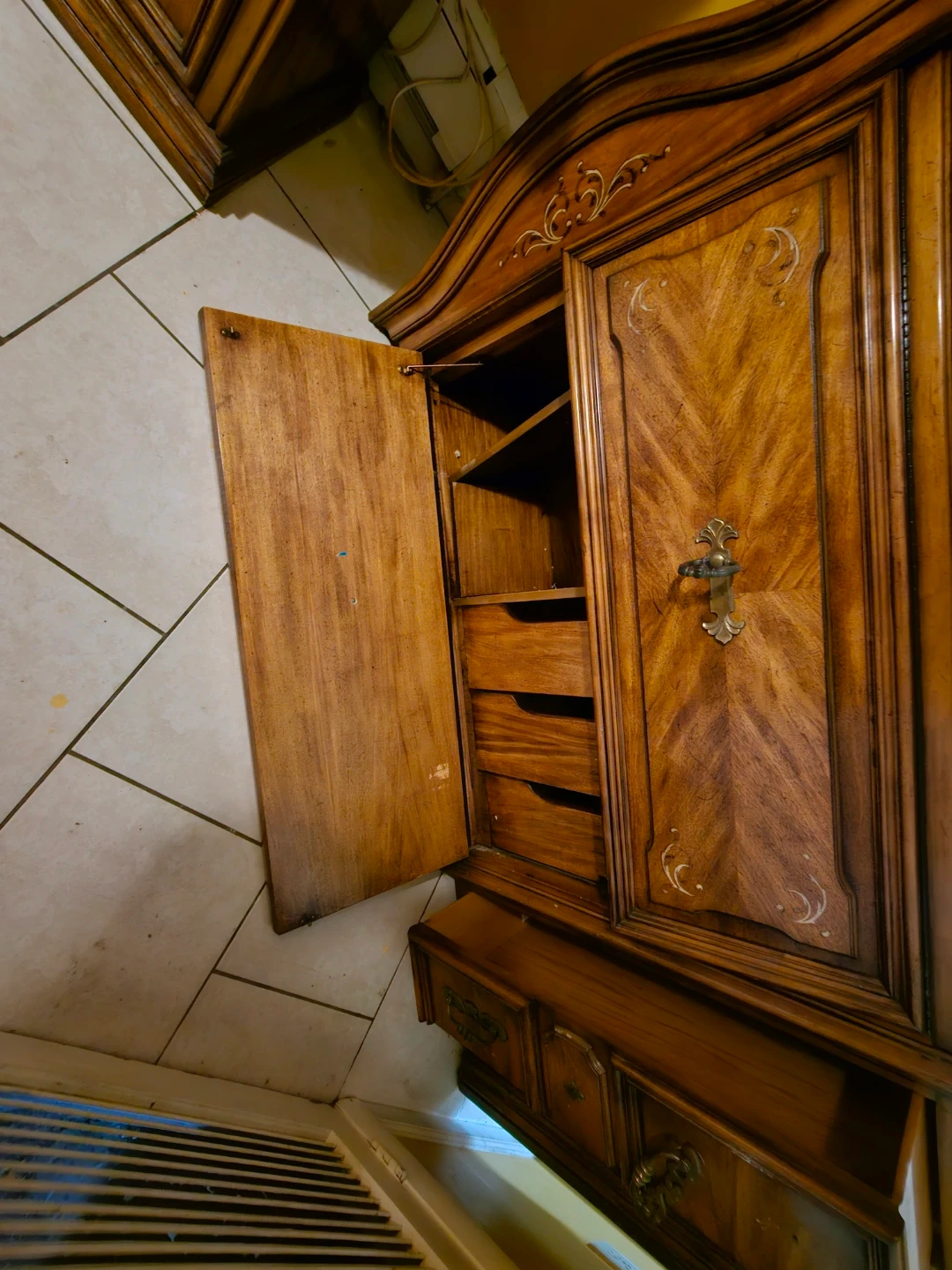 This is a beautiful vintage wooden armoire with decorative detailing. It features double doors opening to shelves and drawers inside, plus additional drawers at the bottom. The wood has a rich finish and ornate handles.