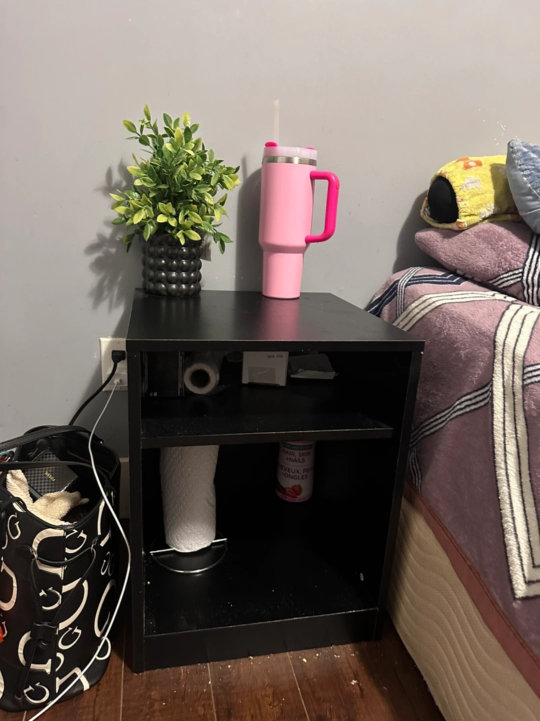 This black end table has two open shelves for storage. It's perfect for placing next to a bed or couch. The top surface is flat for displaying items.