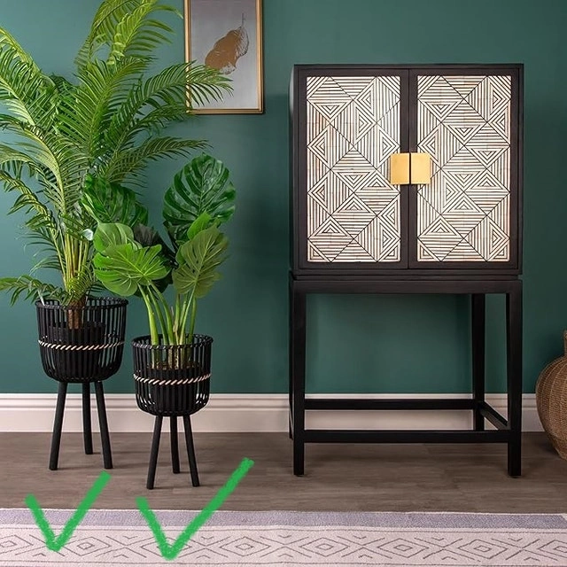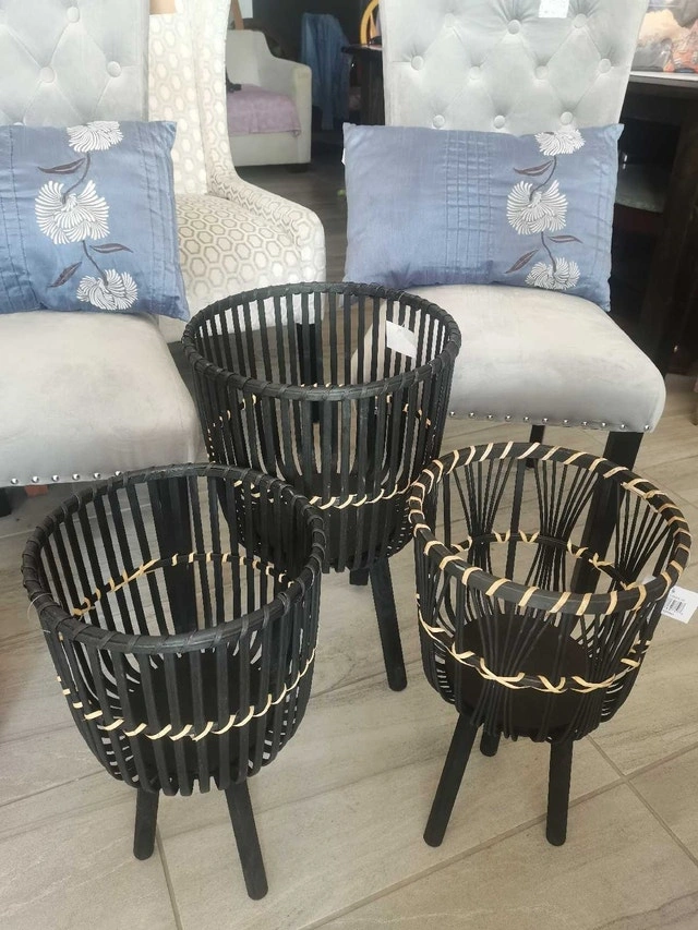 Brand new set of 3 Edmund 2 Piece Tri-Footed Bamboo Planter Set for Garden, Patio, Entryway, or Livining room -one tall, size 23"x12" -two smaller, size 19"x10" (see first picture for different breading wicker line pattern color black pickup near chinook --------- Layer texture and a playful modern look with this pair of cachepot stands. Crafted from eco-friendly bamboo, they feature airy basket designs with a band around the center for an eclectic vibe. Tripod bases give them a little lift, so they elevate your plants off of the floor. One stand is taller than the other, so they also add some visual dimension to a room. These work best if you're placing a plant already in a pot inside them. Features The black finish of these Sagebrook Home bamboo footed planters adds a modern and sleek touch to any décor, making them a versatile addition to your indoor or outdoor space. -Perfect for use in your garden, patio, or living room, these planters are sure to elevate the look of any area they are placed in. -The black finish creates a bold and dramatic look, while the light airy openness of the planter adds depth and dimension to your home décor. -The larger planter measures 23" high x 12" diameter, and the smaller one measures 19" high x 10" diameter, perfect for displaying a variety of plants and flowers. -Constructed with durable and weather-resistant bamboo wood, these planters are built to last and withstand outdoor elements as well as being designed to elevate your indoor spaces. -The woven bamboo and footed design adds an elevated touch, ensuring that your plants stay well-drained and healthy while also providing a stylish display option.