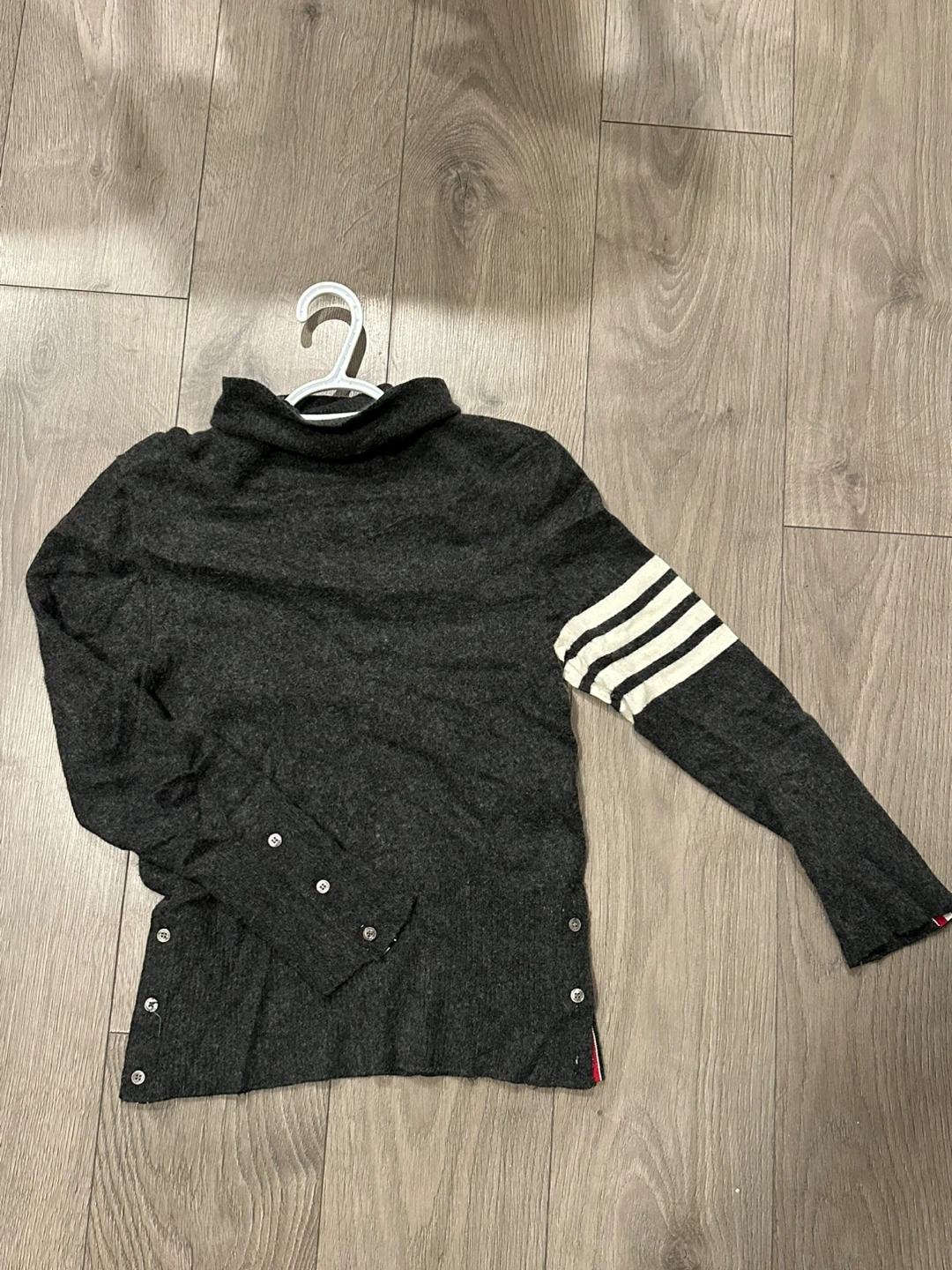 Charcoal grey Thom Browne turtle neck sweater. Features the signature four-bar stripes on the left sleeve and button detailing along the side seams.