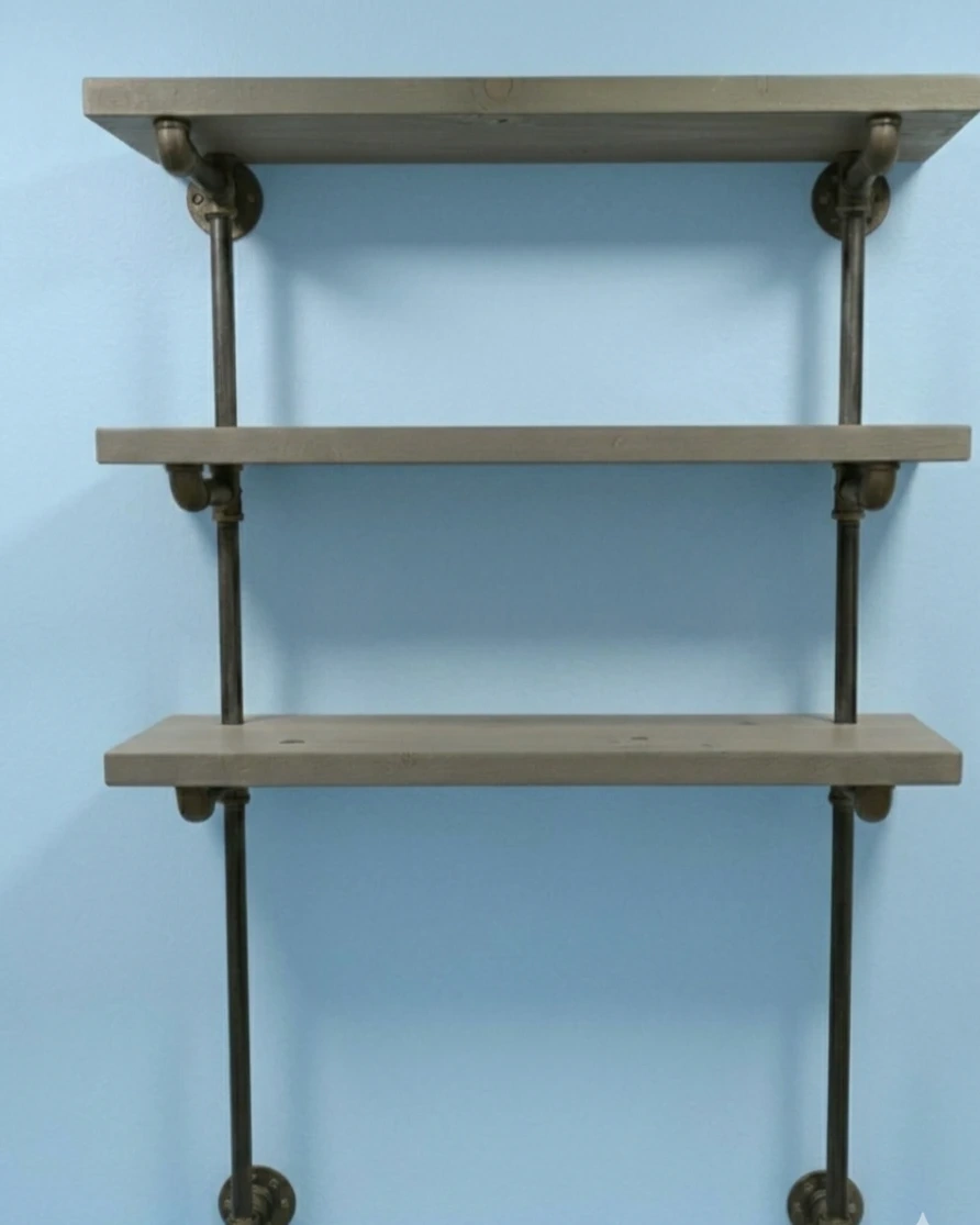 This industrial-style shelving unit features three grey wood shelves supported by dark metal pipes. It's perfect for displaying books, plants, or decorative items in any room. The open design adds a modern, rustic touch to your home.