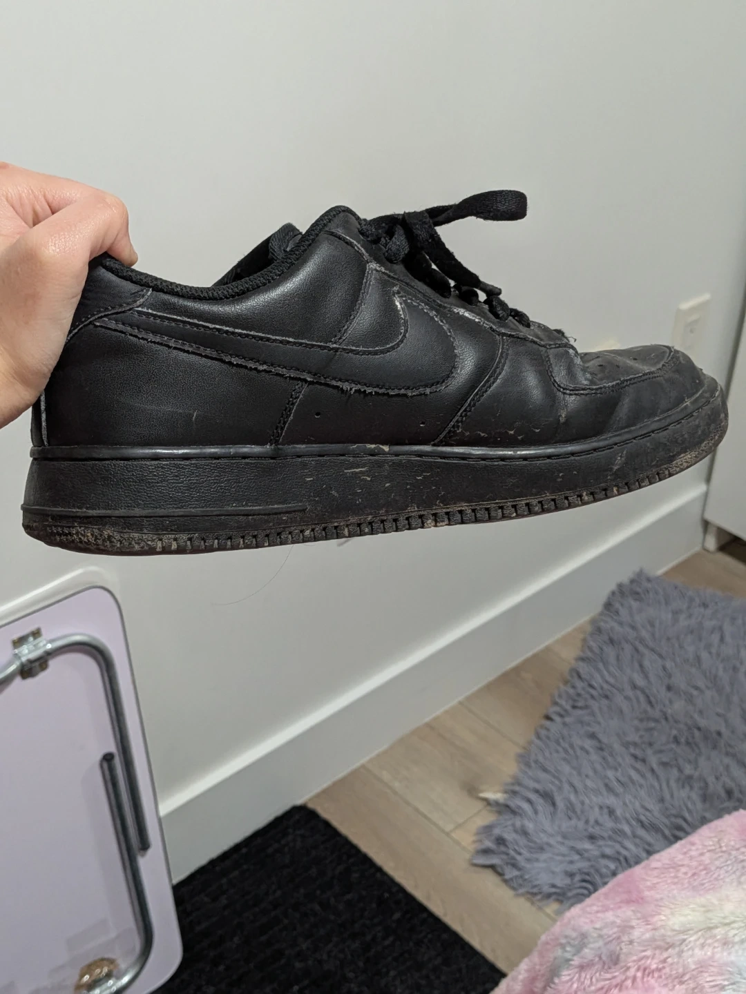 Classic black Nike Air Force 1 Low sneakers. These kicks feature a leather upper and rubber sole. They show signs of wear but are still ready for more adventures. Perfect for everyday wear or casual outings!