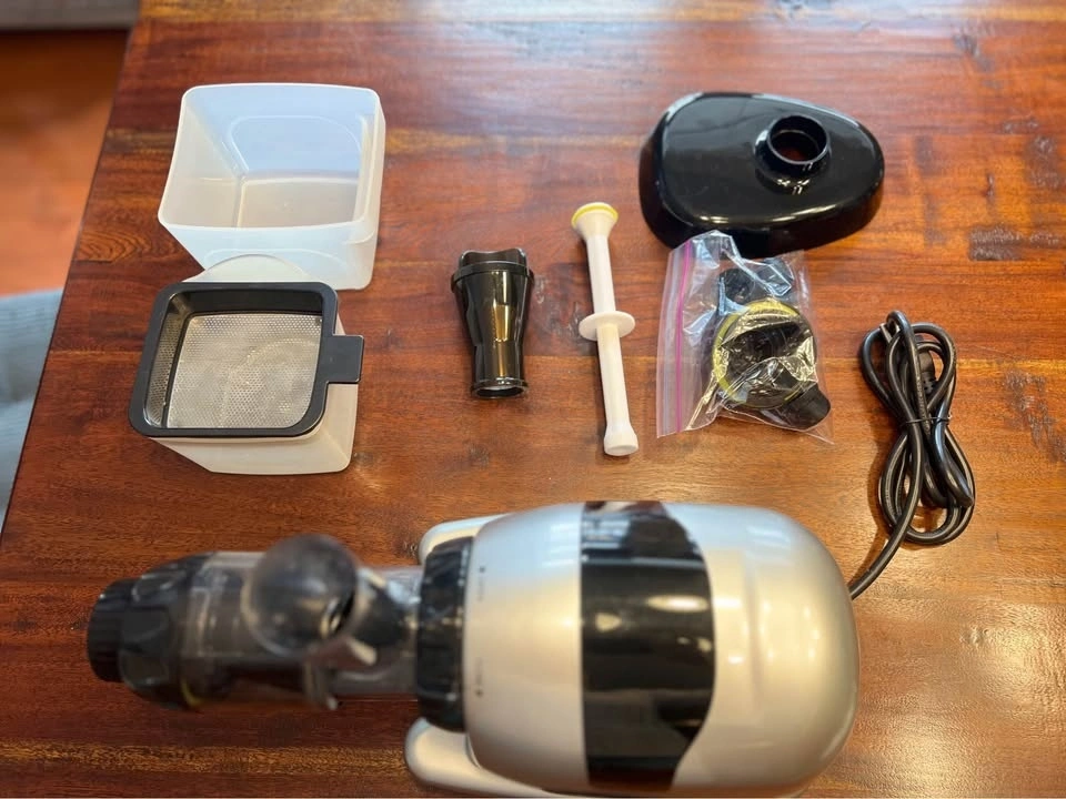 This is the Omega J8006HDS Nutrition Center, a horizontal, slow-speed (80 RPM) masticating juicer. It's designed for high juice yield and maximum nutrient retention. This quiet, silver machine uses a triple-stage system to process fruits, vegetables, and leafy greens while minimizing heat build-up and oxidation. It can also be used to make nut butters, pasta, and baby food.