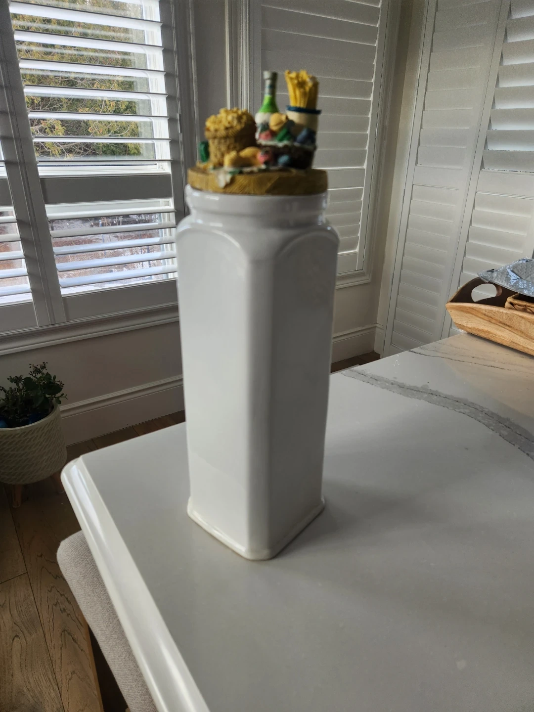 Selling a cute decorative kitchen canister! It's a white canister with a detailed food-themed design on the lid. Great for adding a touch of whimsy to your kitchen decor. Measures 15inches tall with lid. Excellent condition