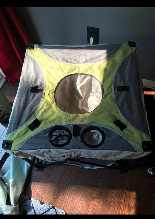Portable activity seat. Folds flat for easy storage. Grey and green colour scheme. Includes carrying bag. Used one time only. It’s in great condition.