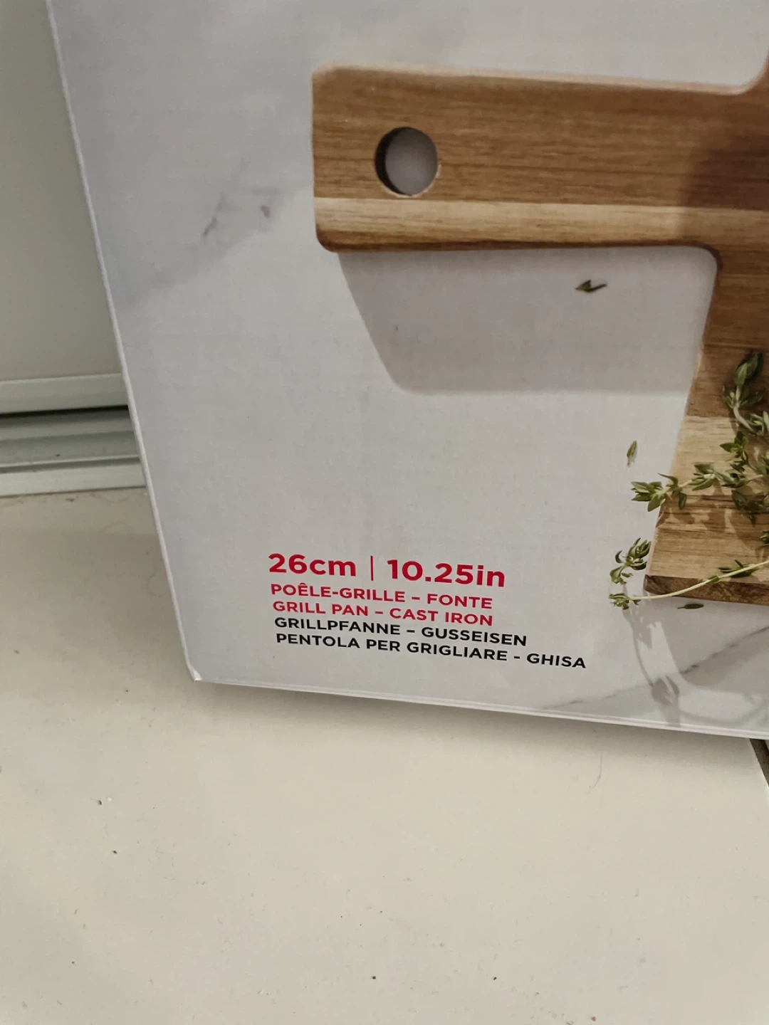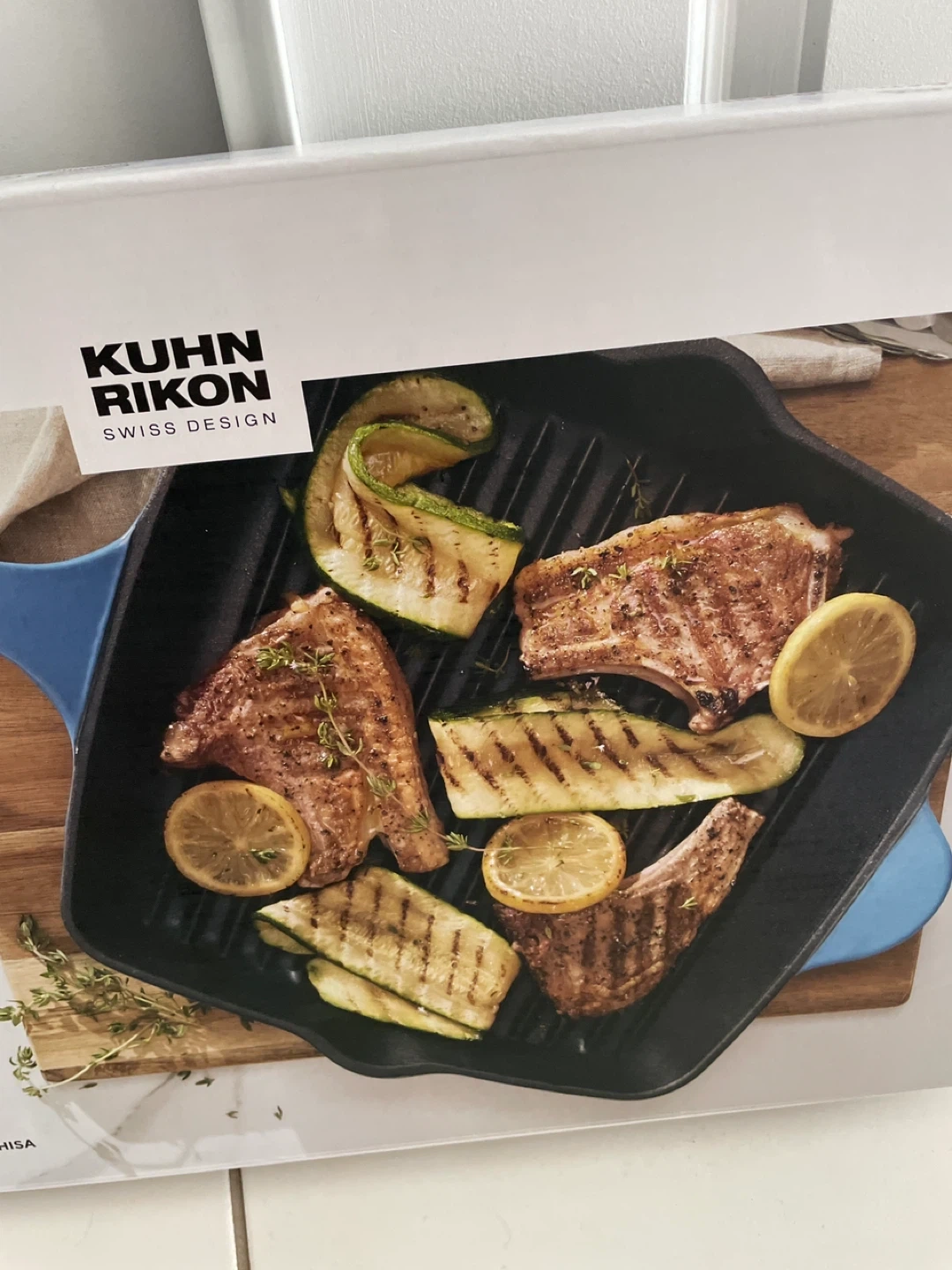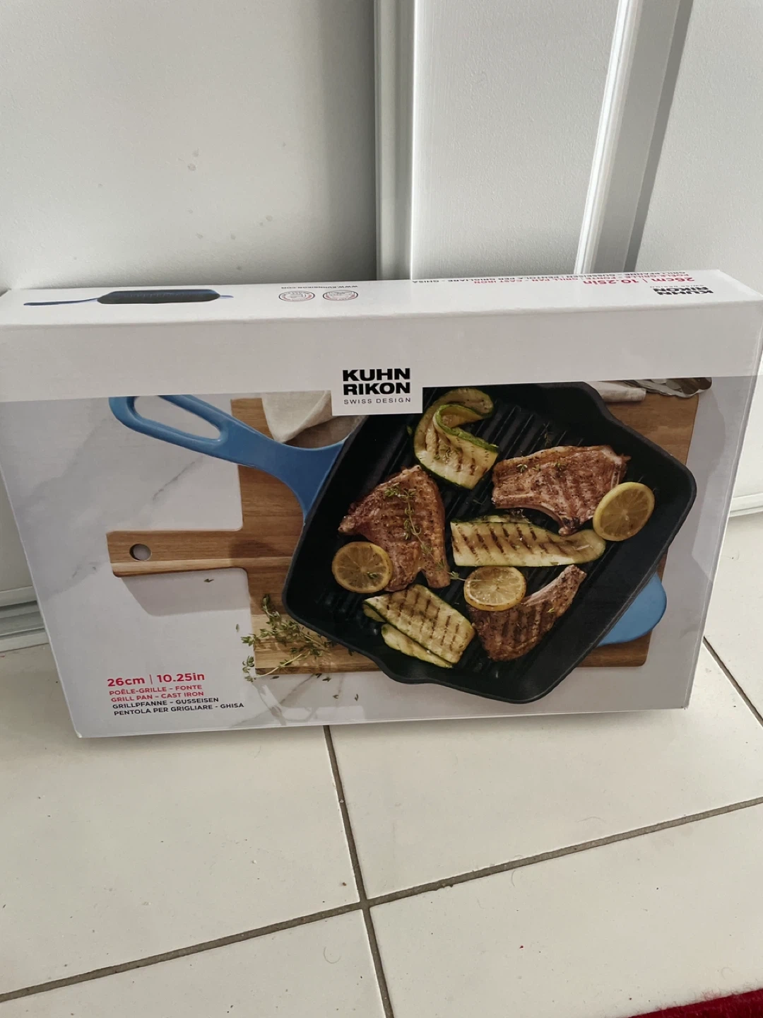 This is a Kuhn Rikon cast iron grill pan. It measures 26cm (10.25in) across. Perfect for grilling meats and vegetables indoors! Brand new in a box