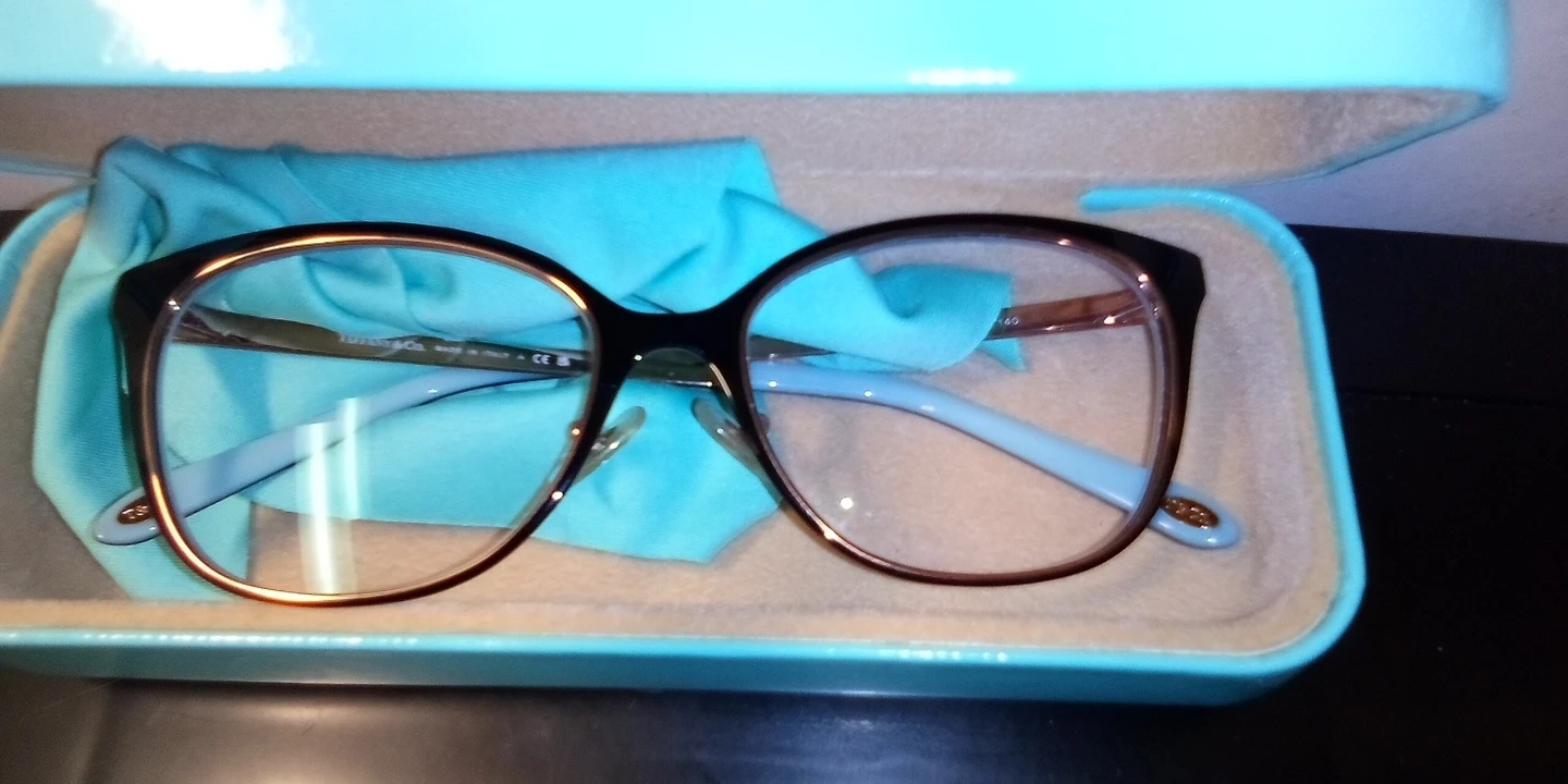 Selling a pair of Tiffany & Co. eyeglasses! They come with the original case and cleaning cloth. The frames are a stylish combination of black and brown with light blue accents on the arms. Perfect for adding a touch of elegance to your everyday look