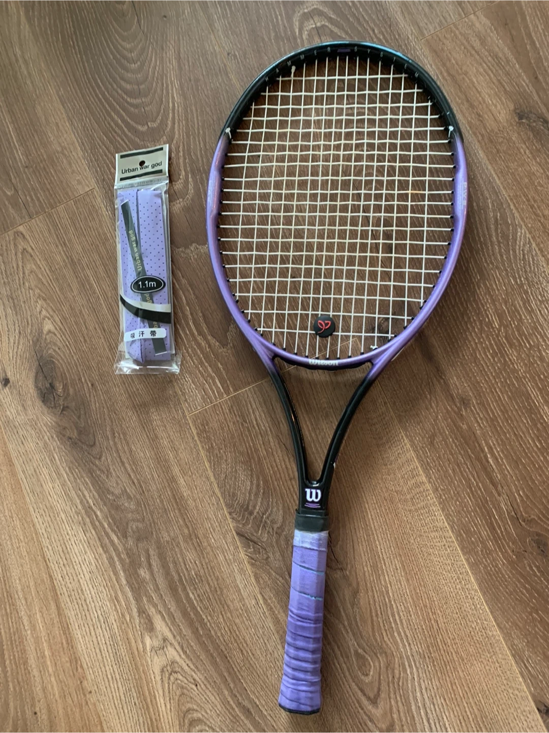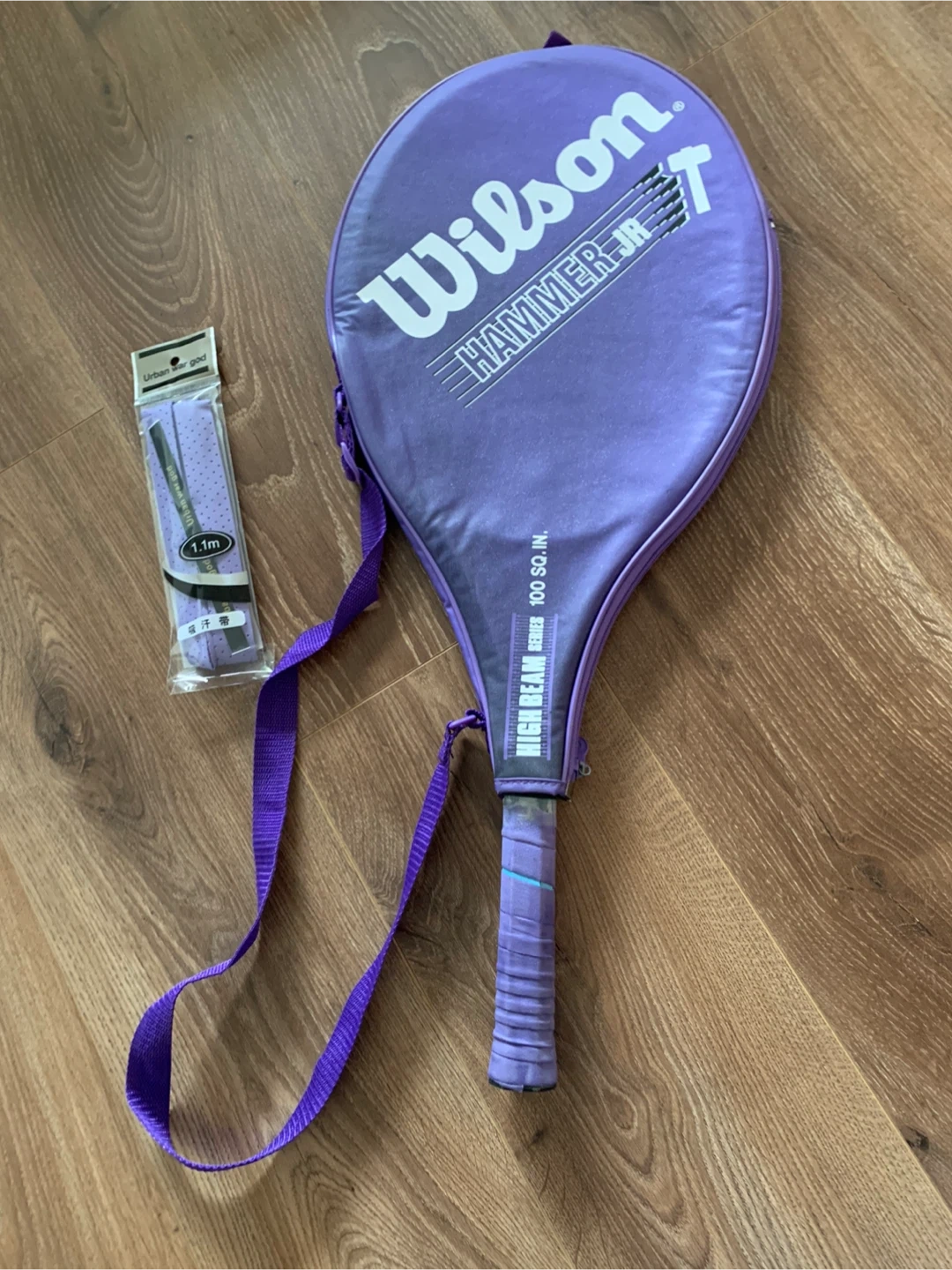 This Wilson Hammer Jr. tennis racket is great for youth players. It's purple and comes with a matching carrying case and additional purple tape for the handle. The recommended tension range is 50-60 lbs. for optimum playability.