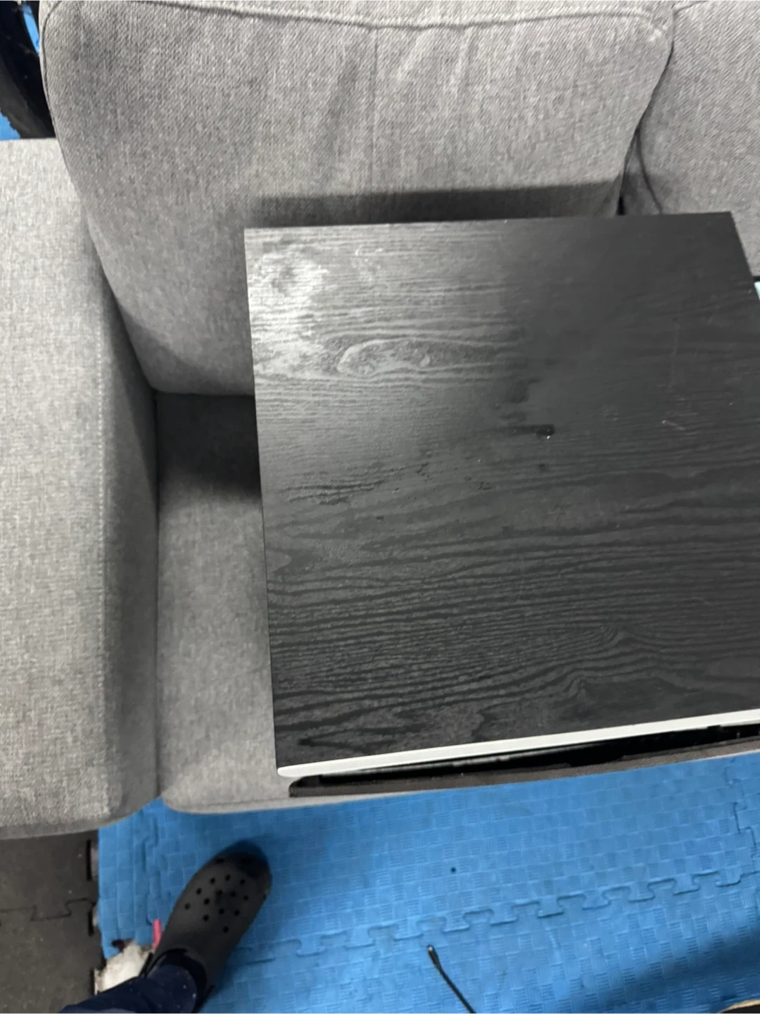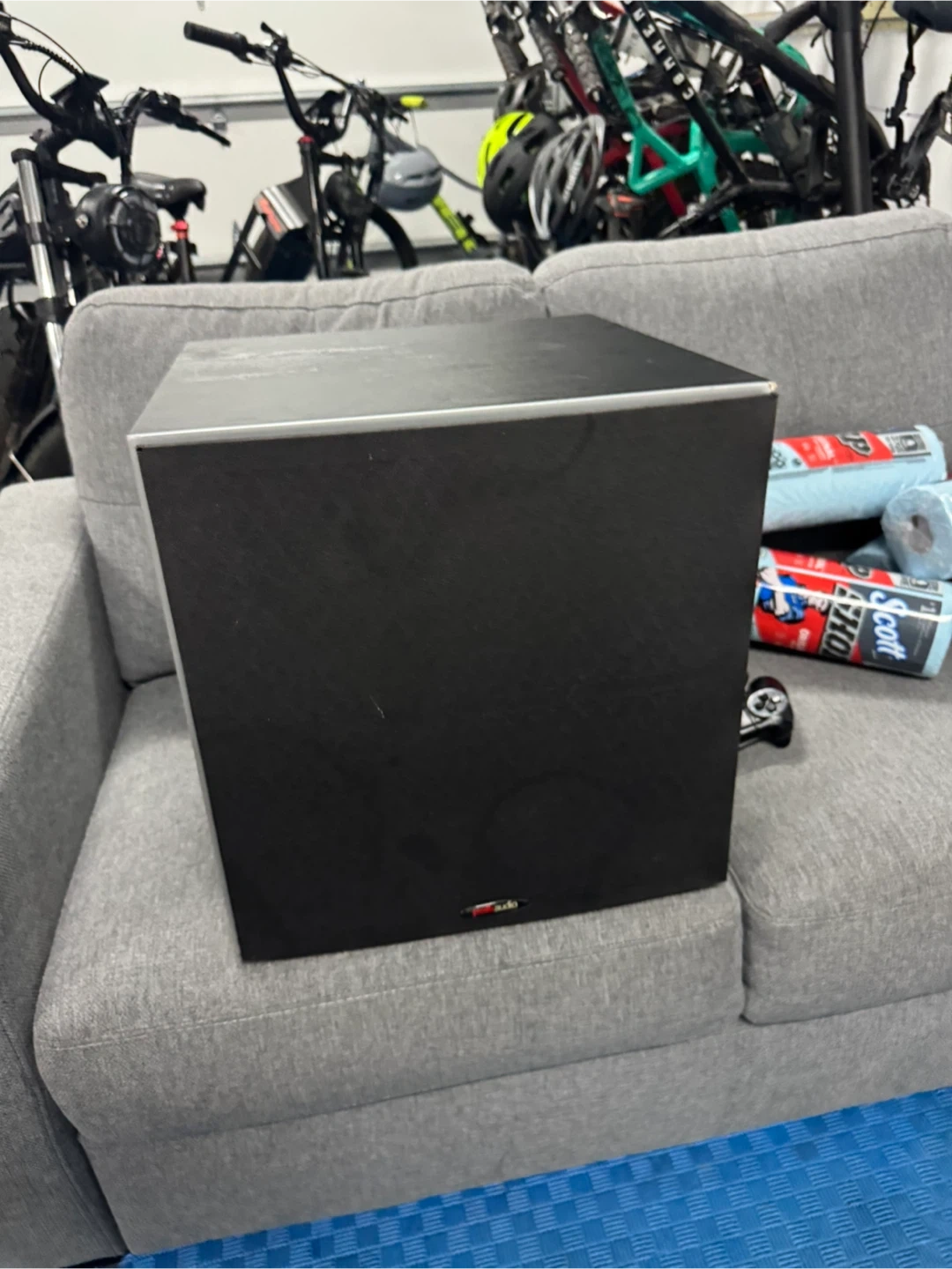This is a Polk Audio powered subwoofer. It's black and cube-shaped. Connects via line in or speaker level output.