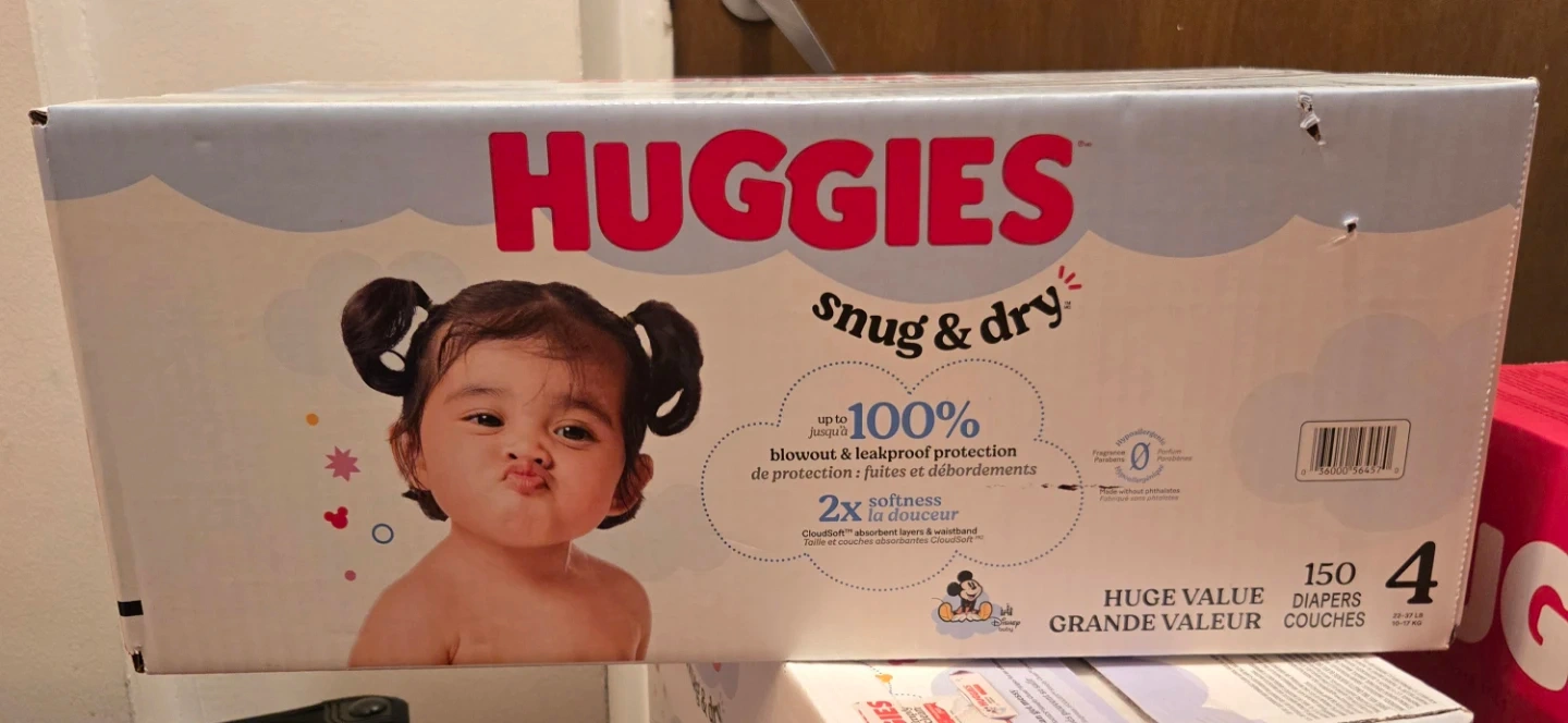 Huggies Snug & Dry diapers in size 4. This box contains 150 diapers and offers up to 100% blowout & leakproof protection. They're made with CloudSoft absorbent layers and waistband for 2x the softness.