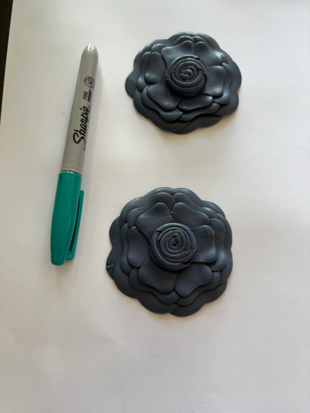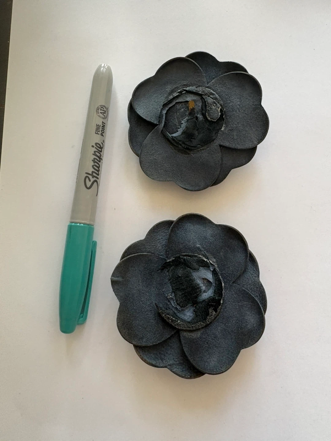 Two navy leather rose embellishments . These can be used for crafts or to add detail to clothing, shoes or accessories.
