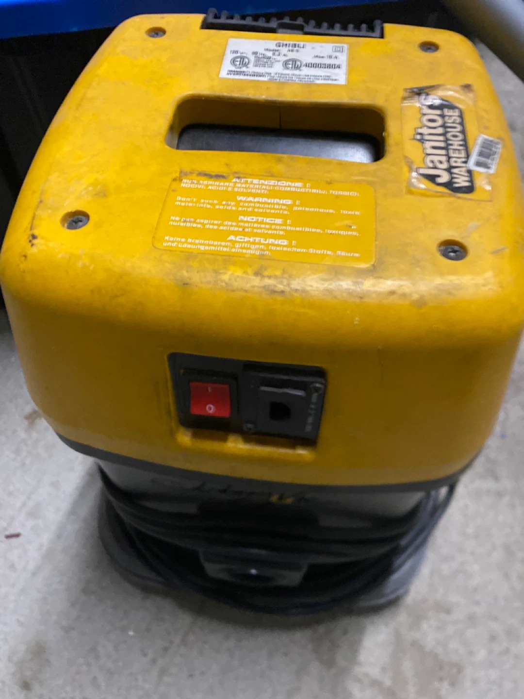 This is a Ghibli AS 5 vacuum cleaner. It's yellow and grey. Includes floor tool. 120V, 60 Hz, 8.3 A, Max 10 A.