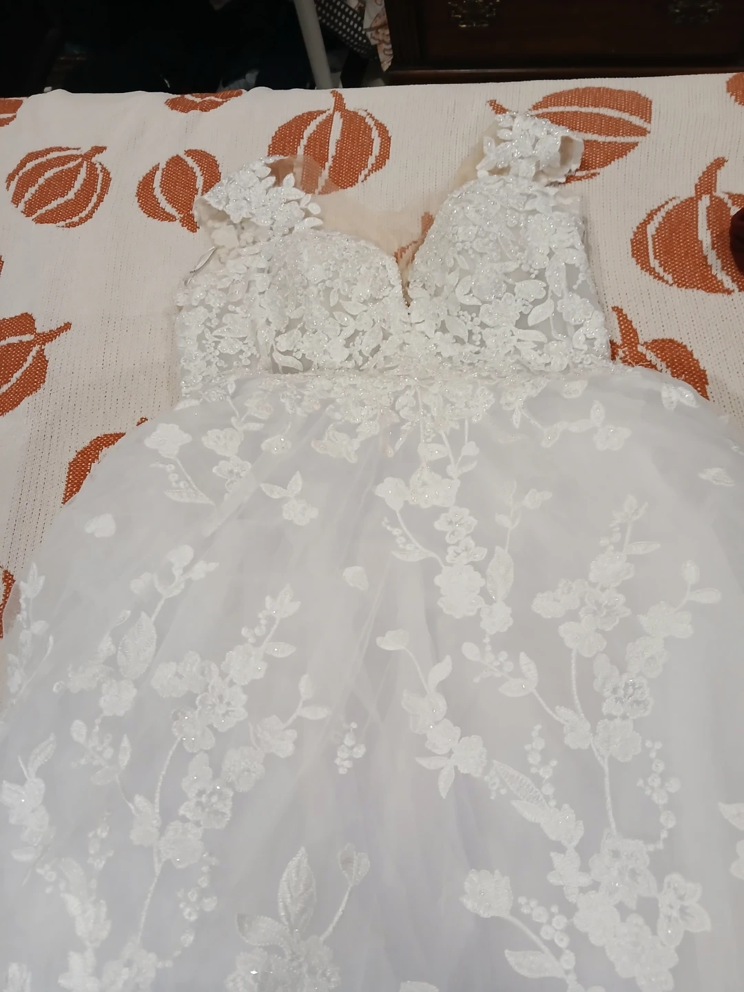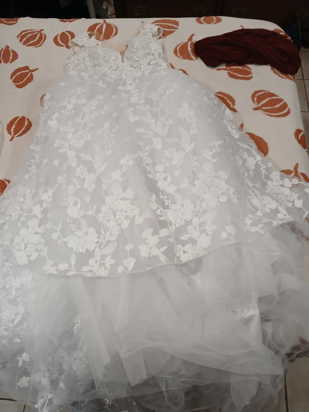 Beautiful white wedding dress. Features intricate lace detailing on the bodice and skirt with delicate beading. Full, flowing skirt with multiple layers of tulle. Perfect for your special day!