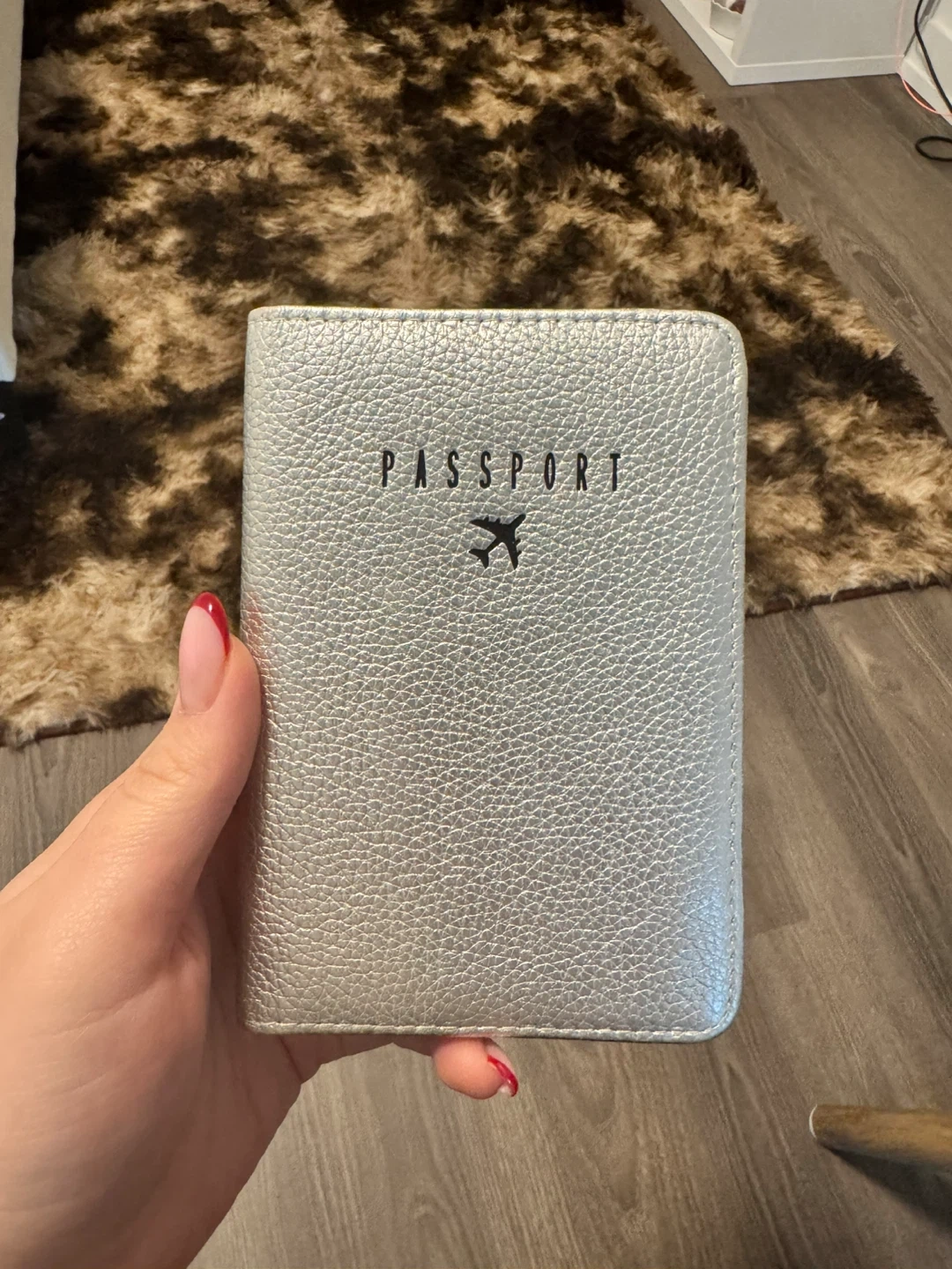 This Aimee Kestenberg passport holder is silver and features the word PASSPORT with a small airplane icon. It has multiple card slots inside and space for your passport. Perfect for keeping your travel documents organized!