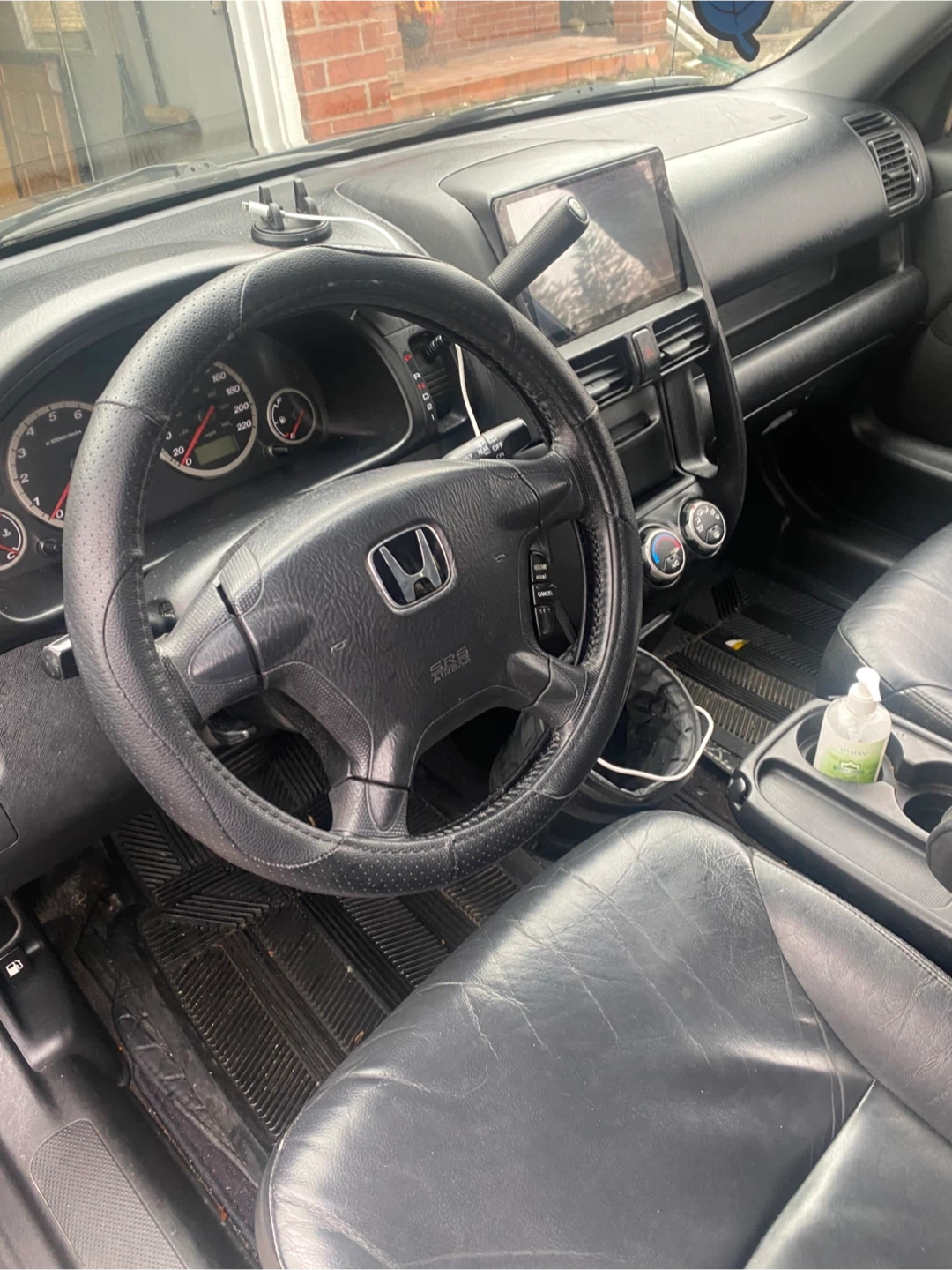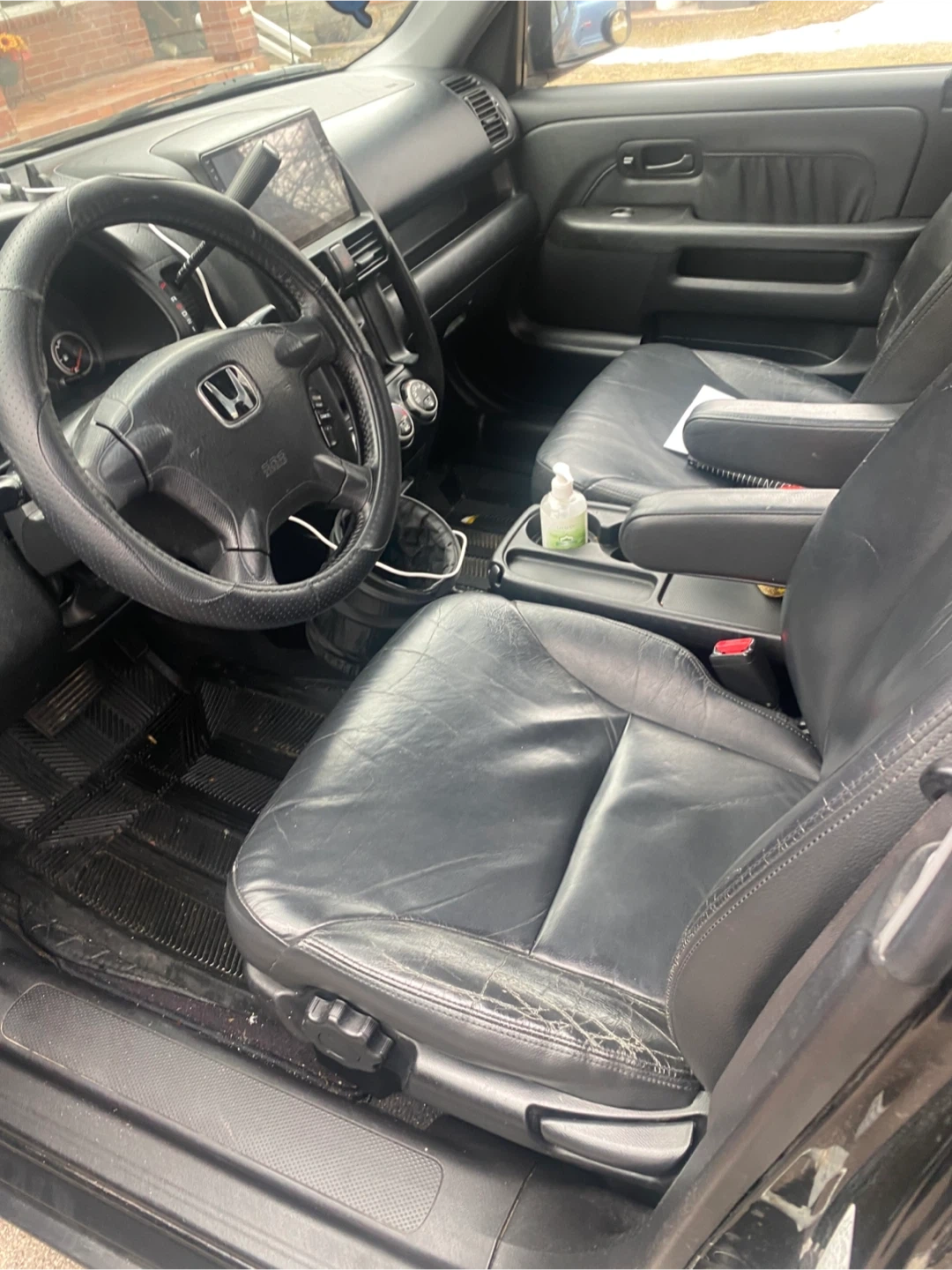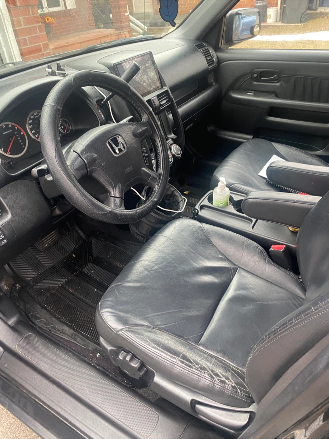 This black Honda CR-V Sport SUV features black leather interior. It's a reliable vehicle for daily commutes and family trips. It's seen some wear and tear, especially on the driver's seat.
