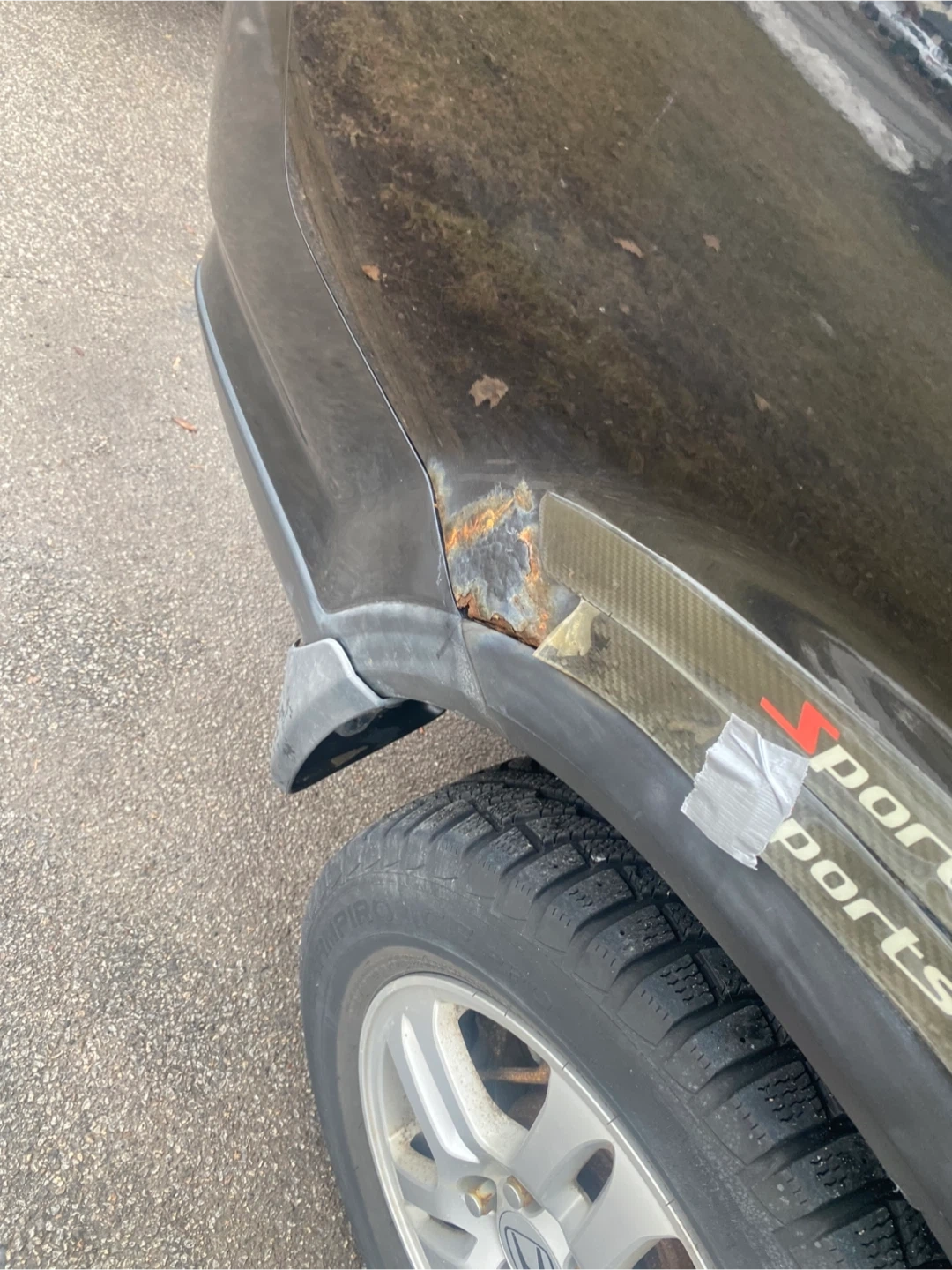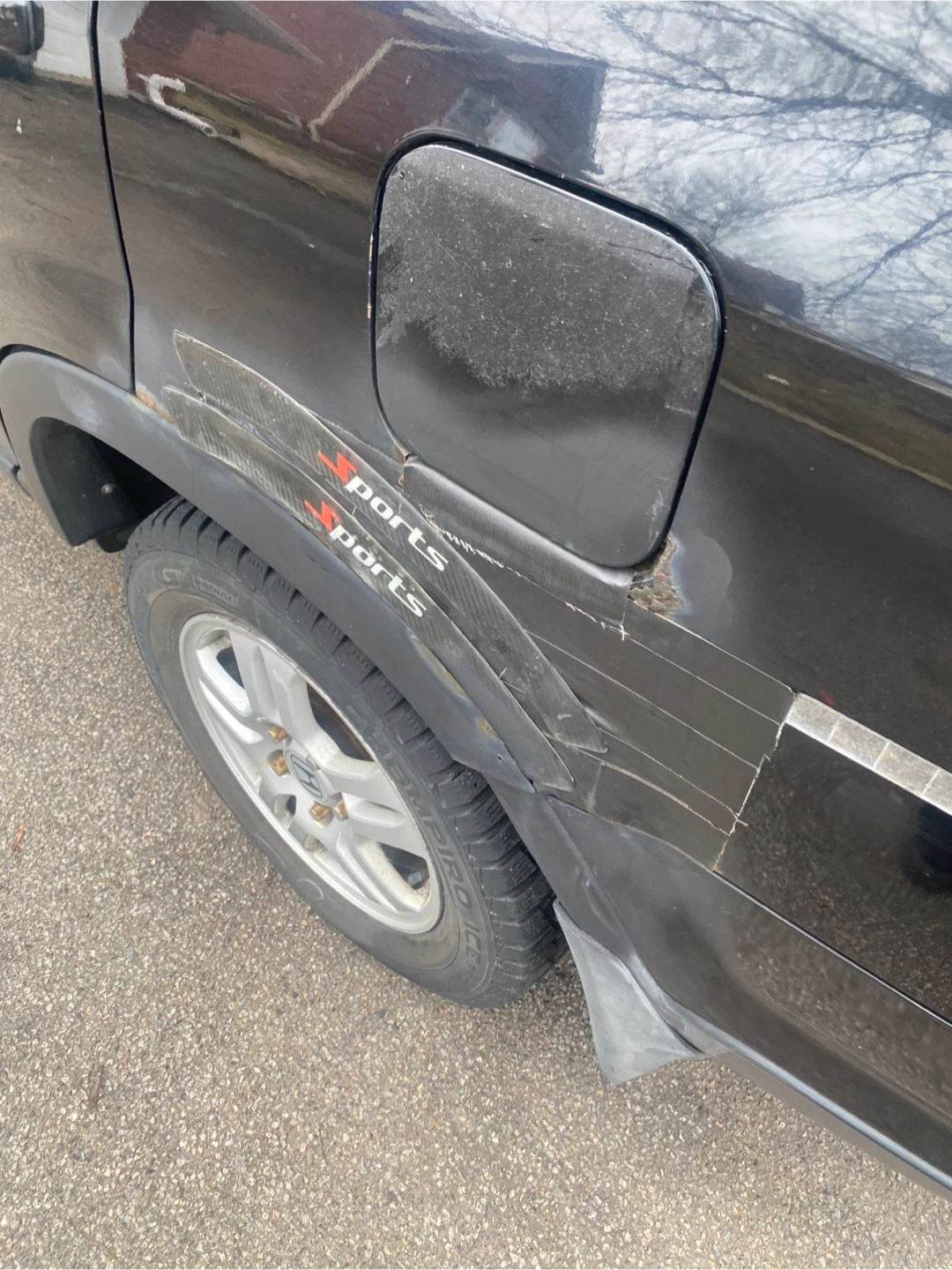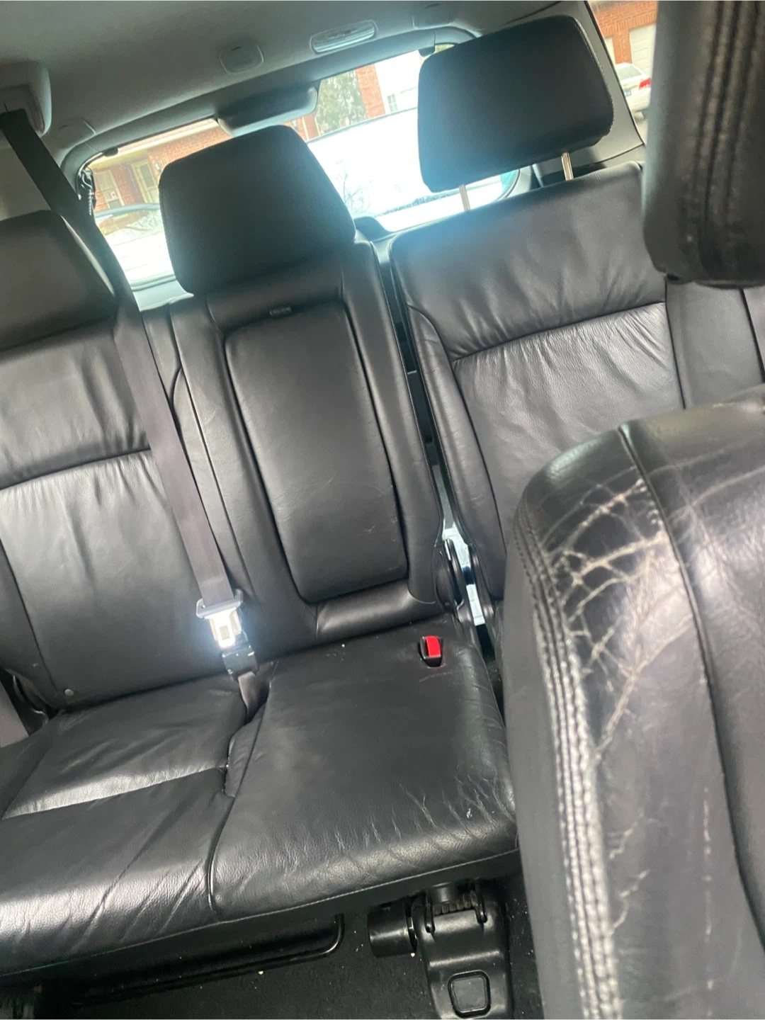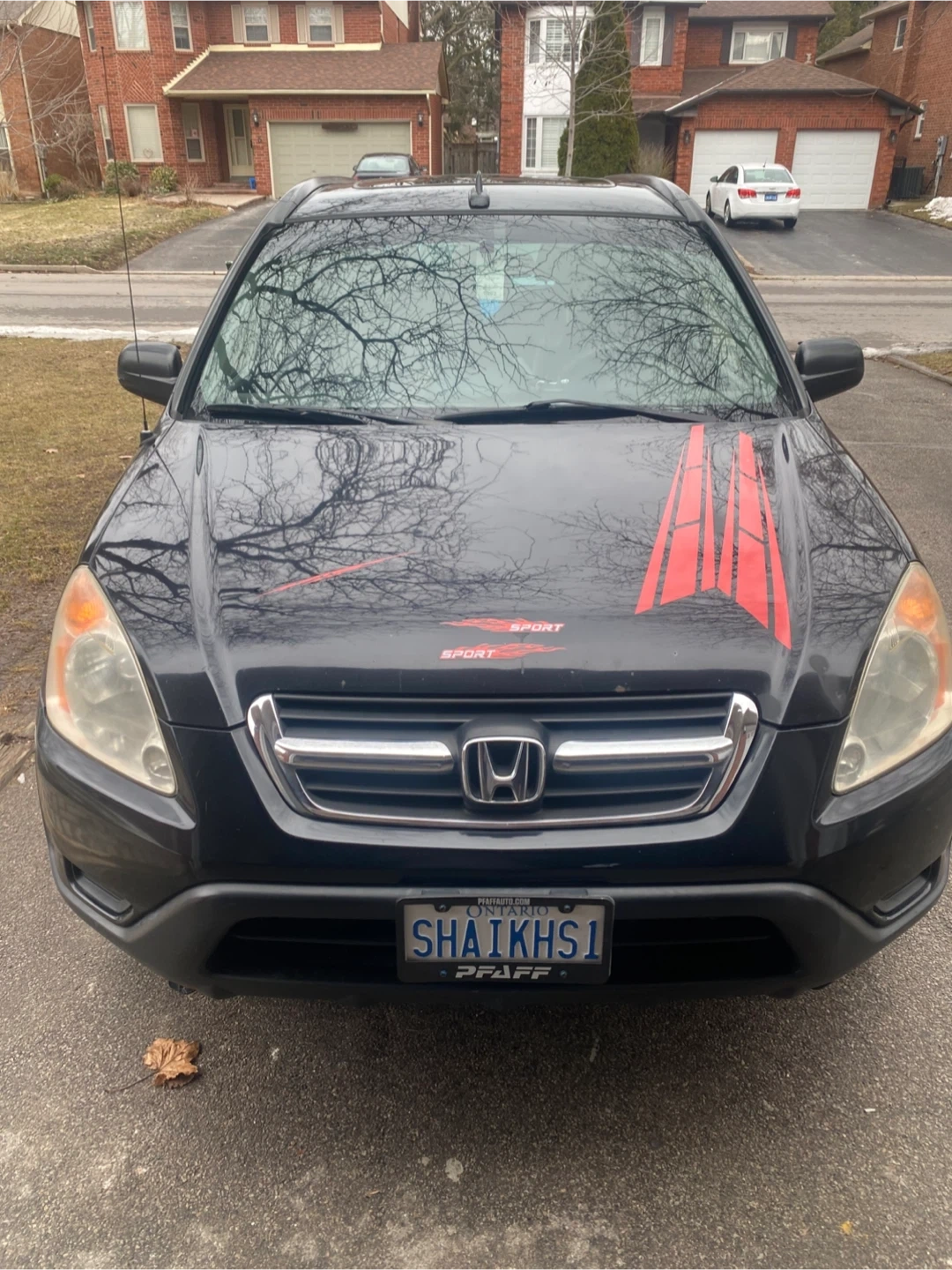 This black Honda CR-V Sport SUV features black leather interior. It's a reliable vehicle for daily commutes and family trips. It's seen some wear and tear, especially on the driver's seat.
